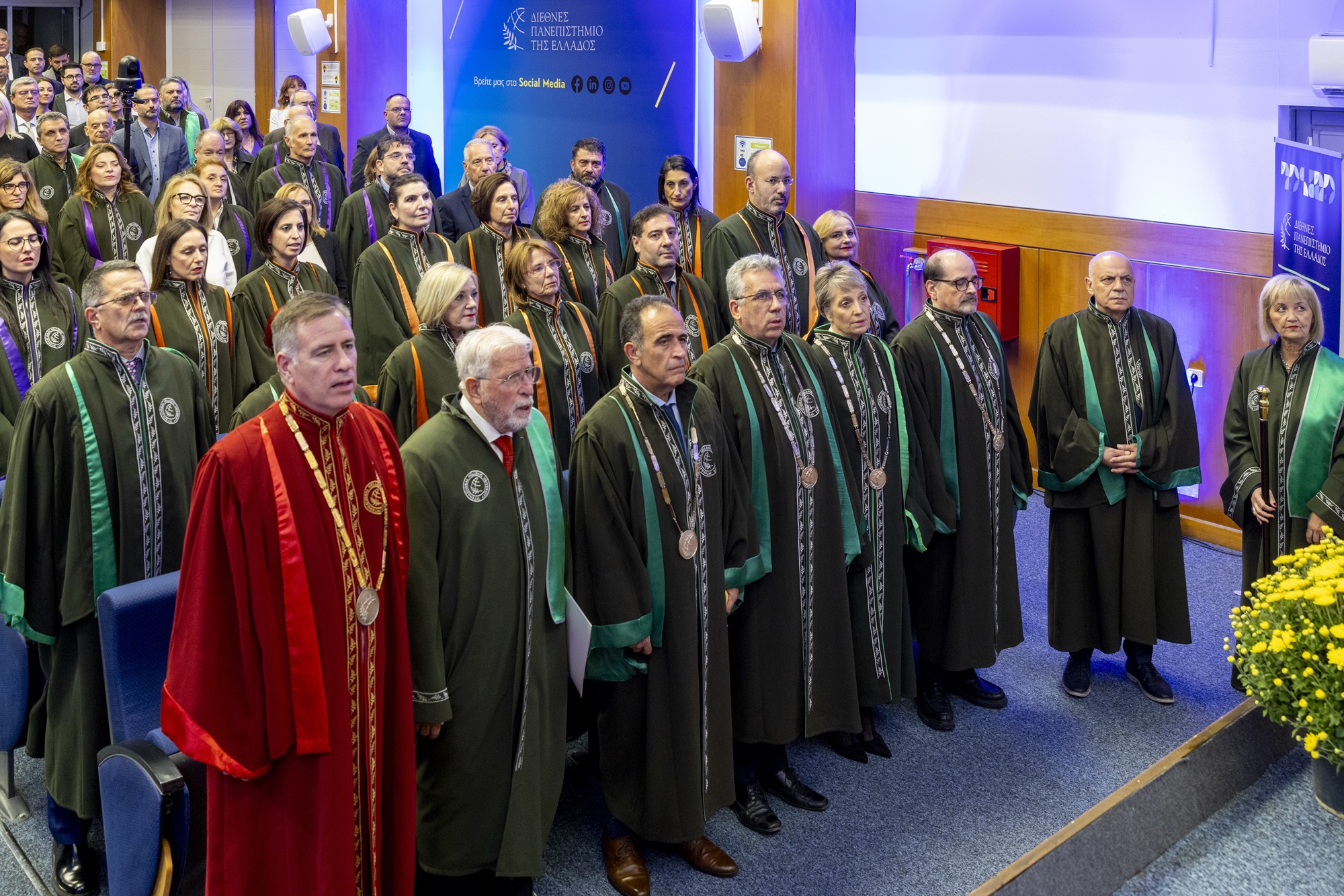 Στο κατάμεστο Αμφιθέατρο ο Πρύτανης του Διεθνούς Πανεπιστημίου της Ελλάδος, Καθηγητής Σταμάτης Αγγελόπουλος ανέφερε, μεταξύ άλλων στην ομιλία του «κύριε Πρόεδρε, η σημερινή αναγόρευση αποκτά ξεχωριστή σημασία, διότι ο δικός σας αγώνας για την υγειονομική αριστεία και την τεχνολογική καινοτομία βρίσκει άμεση ανταπόκριση στις βασικές αξίες του Διεθνούς Πανεπιστημίου της Ελλάδος. Το ΔΙΠΑΕ, ως ένα από τα μεγαλύτερα Πανεπιστήμια της χώρας, έχει ενσωματώσει την καινοτομία στον πυρήνα της αποστολής του. Η έμφαση στην έρευνα αιχμής και η διαρκής αναβάθμιση των προγραμμάτων σπουδών μας, αποσκοπούν στη δημιουργία αποφοίτων ικανών να πρωταγωνιστήσουν στο σύγχρονο, απαιτητικό περιβάλλον της υγείας. Οι φοιτητές μας, με γνώση και υψηλή κατάρτιση, αποτελούν τη ζωτική δύναμη που τροφοδοτεί κορυφαίες δομές όπως και ο Όμιλος Ιατρικού Αθηνών. Η επιλογή μας να σας τιμήσουμε αναδεικνύει ακριβώς αυτή τη σύγκλιση στόχων: τη δέσμευση του Πανεπιστημίου στην παραγωγή γνώσης και τη δική σας δέσμευση στην πρακτική εφαρμογή της, με στόχο την αναβάθμιση της ζωής του πολίτη».