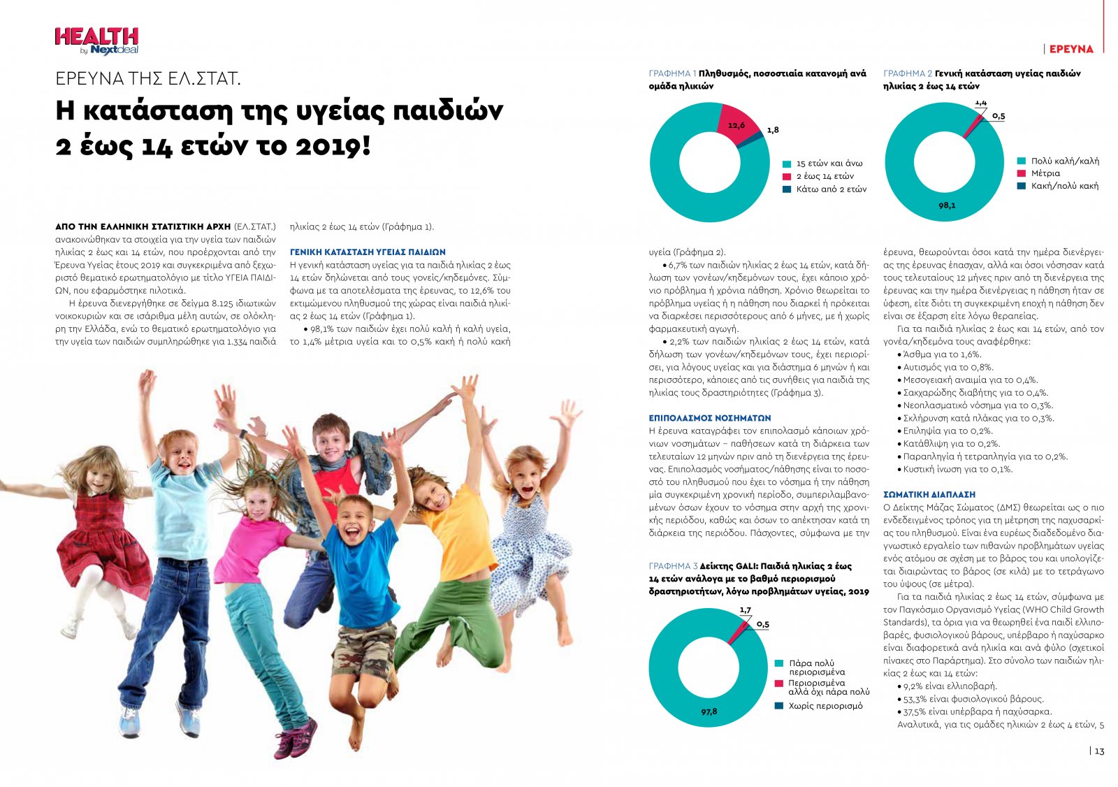 Από την Ελληνική Στατιστική Αρχή (ΕΛ.ΣΤΑΤ.) ανακοινώθηκαν τα στοιχεία για την υγεία των παιδιών ηλικίας 2 έως και 14 ετών, που προέρχονται από την Έρευνα Υγείας έτους 2019 και συγκεκριμένα από ξεχωριστό θεματικό ερωτηματολόγιο με τίτλο ΥΓΕΙΑ ΠΑΙΔΙΩΝ, που εφαρμόστηκε πιλοτικά.