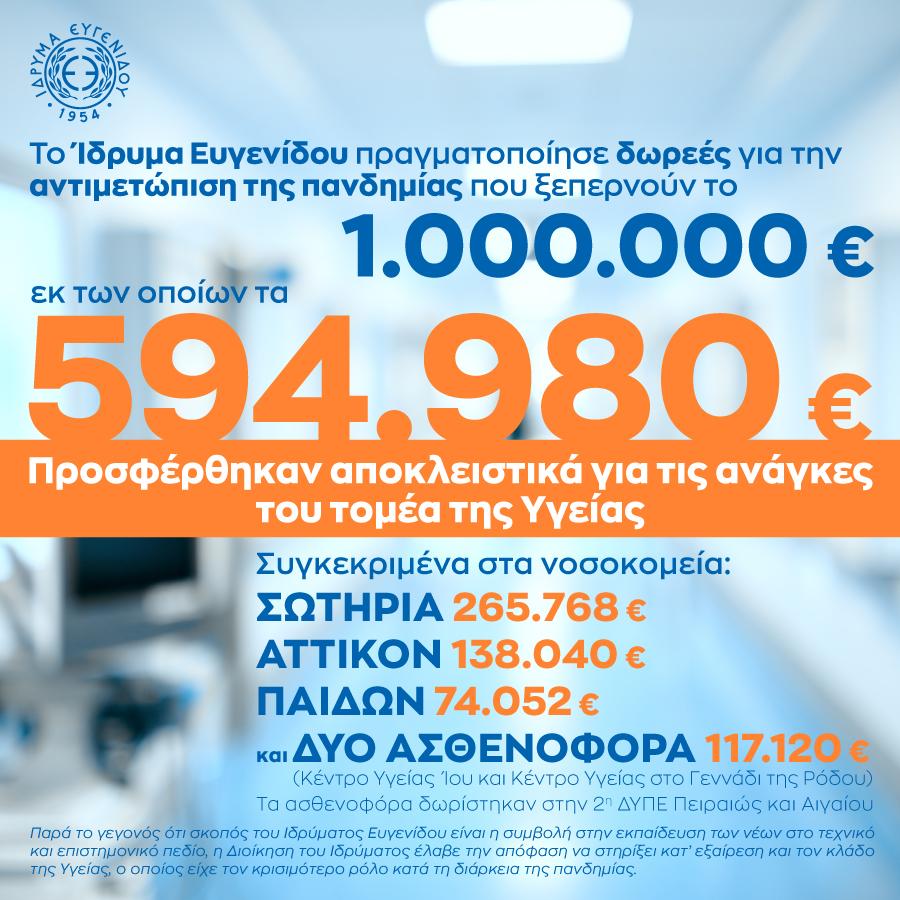 Συνολικά το Ίδρυμα Ευγενίδου πραγματοποίησε δωρεές που ξεπερνούν το 1.000.000 ευρώ, εκ των οποίων τα 594.980,65 € δόθηκαν αποκλειστικά στο χώρο της Υγείας.