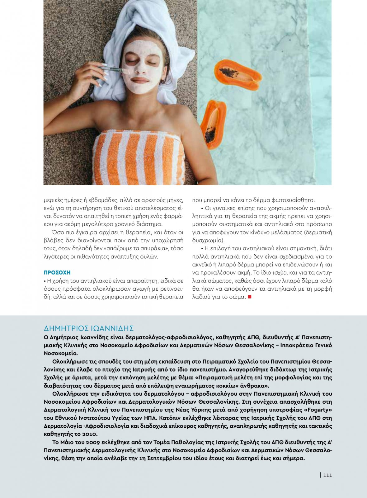- Η χρήση του αντιηλιακού είναι απαραίτητη, ειδικά σε όσους πρόσφατα ολοκλήρωσαν αγωγή με ρετινοειδή, αλλά και σε όσους χρησιμοποιούν τοπική θεραπεία