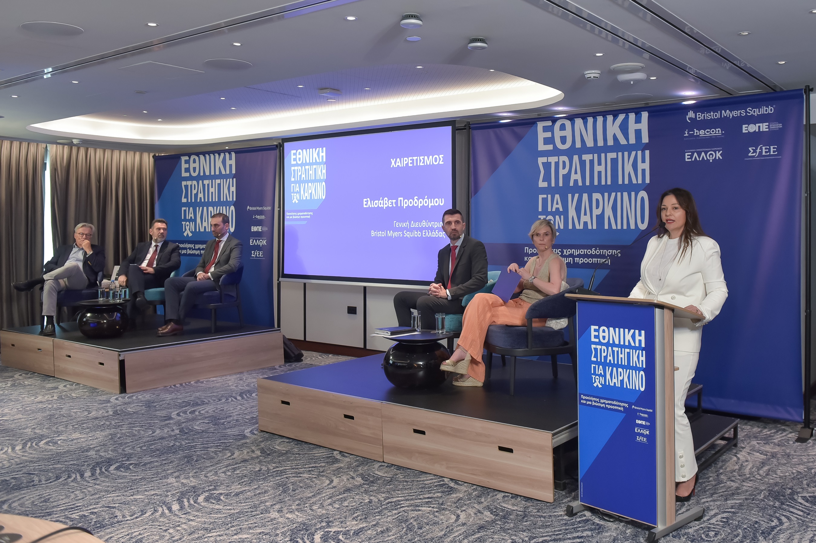 Κεντρική φωτογραφία από τα αριστερά προς τα δεξιά : Ο κ. Γιώργος Καπετανάκης, Πρόεδρος Ελληνικής Ομοσπονδίας Καρκίνου (ΕΛΛ.Ο.Κ.), ο κ. Γιώργος Τσιακαλάκης, Corporate & Government Affairs Lead, Bristol Myers Squibb Ελλάδας, η κα Ελισάβετ Προδρόμου, Γενική Διευθύντρια, Bristol Myers Squibb Ελλάδας, 0 κ. Μιχάλης Χειμώνας, Γενικός Διευθυντής Συνδέσμου Φαρμακευτικών Επιχειρήσεων Ελλάδος (Σ.Φ.Ε.Ε.), η κα Ζένια Σαριδάκη – Ζώρα, Παθολόγος-Ογκολόγος, Πρόεδρος Δ.Σ. Εταιρείας Ογκολόγων Παθολόγων Ελλάδας (ΕΟΠΕ), Διευθύντρια Α᾽ Ογκολογικής Κλινικής Metropolitan Hospital & “Ασκληπιός ΔΙΑΓΝΩΣΙΣ”, ο κ. Κώστας Αθανασάκης, Επίκουρος Καθηγητής Οικονομικών της Υγείας και Οικονομικής Αξιολόγησης των Τεχνολογιών Υγείας, Τμήμα Πολιτικών Δημόσιας Υγείας, Πανεπιστήμιο Δυτικής Αττικής