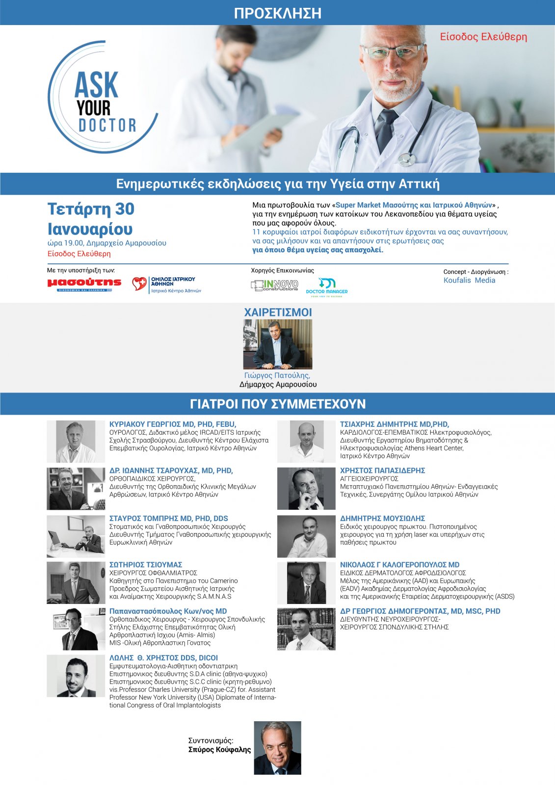 Πρώτος σταθμός των ενημερωτικών εκδηλώσεων με τίτλο: “ASK Your Doctor”, θα είναι ο Δήμος Αμαρουσίου, με την αντίστοιχη, ανοικτή εκδήλωση για το ευρύ κοινό, να πραγματοποιείται σήμερα, Τετάρτη, 30 Ιανουαρίου, στις 19:00, στο Δημαρχείο Αμαρουσίου (Βασ. Σοφίας 9 & Δημ. Μόσχα, ΤΚ: 151 24, Μαρούσι). Στην εκδήλωση θα συμμετέχουν δώδεκα (12) ιατροί, διαφόρων ειδικοτήτων, οι οποίες, μεταξύ άλλων, περιλαμβάνουν την καρδιολογία, την ουρολογία, τη νευρολογία, τη χειρουργική, την οφθαλμολογία, τη δερματολογία, κ.α.