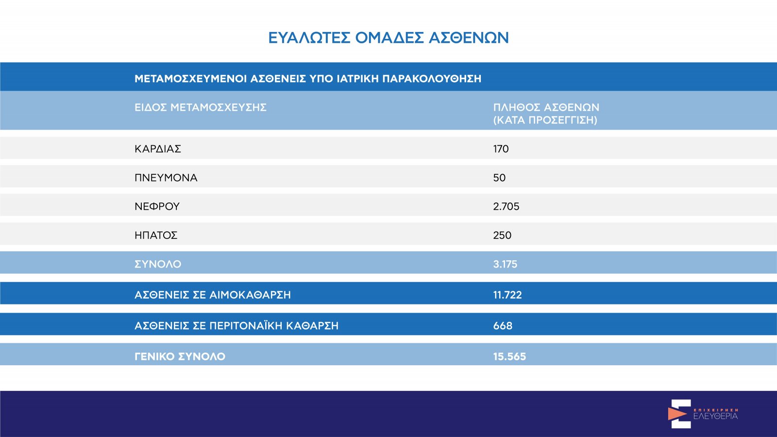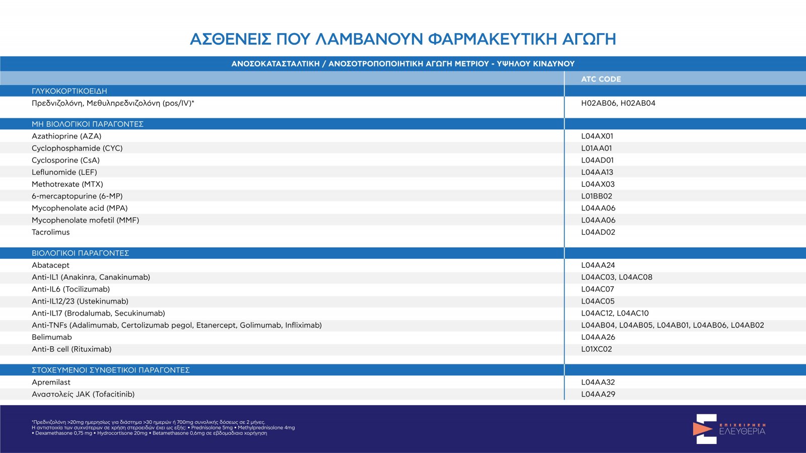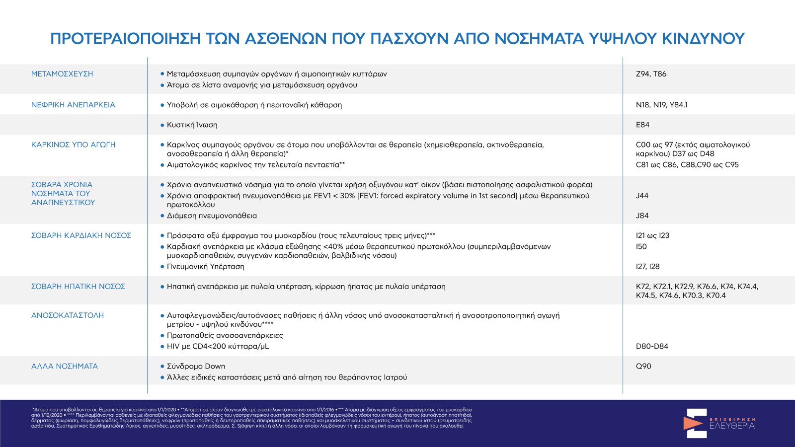 Σύμφωνα με την κα Θεοδωρίδου, τα νοσήματα τα οποία περιλαμβάνονται σε αυτή την πρώτη ομάδα υψηλού κινδύνου θα βρίσκονται αναρτημένα και στο emvolio.gov.gr. Δείτε τους σχετικούς πίνακες: