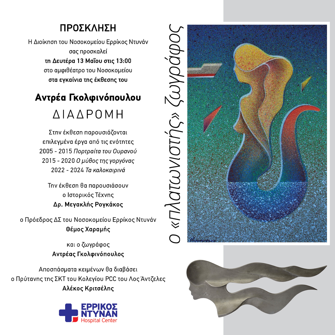 Με μία νέα εικαστική παρέμβαση στον χώρο του νοσοκομείου, με πίνακες ζωγραφικής και μικρά γλυπτά του διακεκριμένου Έλληνα δημιουργού Αντρέα Γκολφινόπουλου, το Ερρίκος Ντυνάν προσφέρει ξανά σε ασθενείς και  επισκέπτες μια εναλλακτική εικόνα για τη λειτουργία του και τον κοινωνικό ρόλο του.