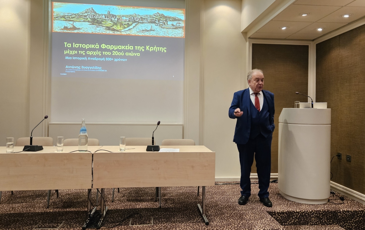 Στο πλαίσιο επιστημονικής ημερίδας η οποία πραγματοποιήθηκε στα Χανιά από τους Φαρμακευτικούς Συλλόγους Χανίων και Ρεθύμνου σε συνεργασία με τον Πανελλήνιο Φαρμακευτικό Σύλλογο και τον Ι.Δ.Ε.Α.Α.Φ, ο συγγραφέας της έκδοσης «Πανόραμα της φαρμακευτικής ιστορίας», Αντώνης Ευαγγελίδης, έκανε μία πλούσια ιστορική αναδρομή στα φαρμακεία της Κρήτης, τονίζοντας τον σημαντικό ρόλο που έπαιξαν στην τοπική κοινωνία αλλά και στη διατήρηση και εξέλιξη της φαρμακευτικής επιστήμης.