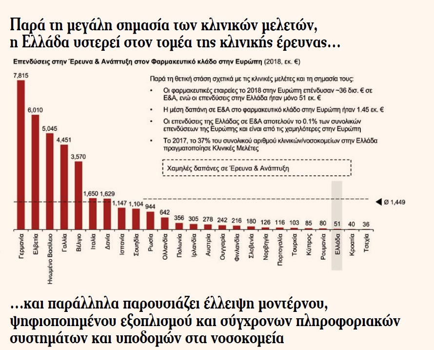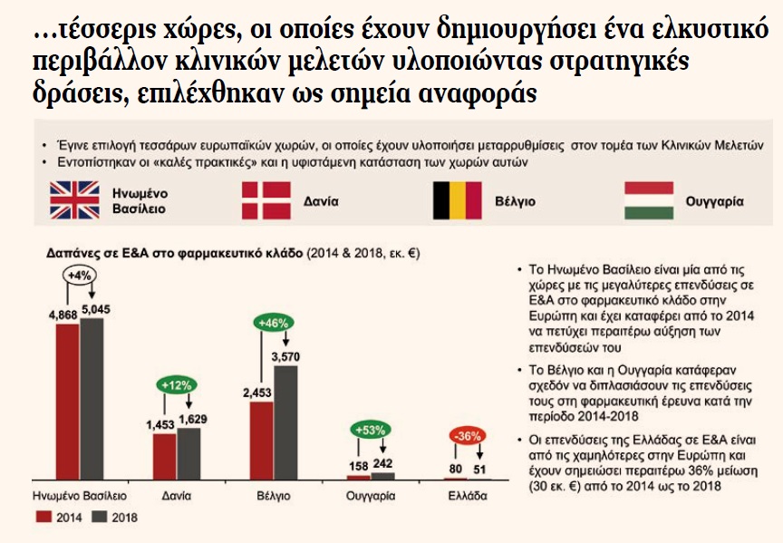 «Την τελευταία διετία η αλήθεια είναι πως έγιναν βήματα προς τη σωστή κατεύθυνση, όπως η εξαίρεση από τη φαρμακευτική δαπάνη των εμβολίων, η δυνατότητα συμψηφισμού των επενδύσεων με το clawback για το ποσό των 100 εκατ. € καθώς και ο τριπλασιασμός του συντελεστή υπερέκπτωσης για επενδύσεις σε έρευνα & ανάπτυξη. Αποτέλεσμα αυτών είναι μια μικρή αύξηση στον αριθμό των κλινικών μελετών κατά τα τελευταία χρόνια, από 134 κλινικές μελέτες το 2018, σε 154 το 2019 και σε 175 το 2020.