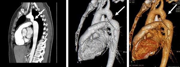 Η ασθενής διερευνήθηκε περαιτέρω με αξονική αγγειογραφία της αορτής για την επιβεβαίωση ή τον αποκλεισμό της διάγνωσης. Η εξέταση έδειξε ελίκωση και ήπια στένωση του αυλού της θωρακικής αορτής περιφερικά της αριστερής υποκλειδίου αρτηρίας (εικόνα – λευκά βέλη) και ήπια μεταστενωτική διάταση της κατιούσας θωρακικής αορτής, ευρήματα συμβατά με ψευδή στένωση του ισθμού της αορτής.
