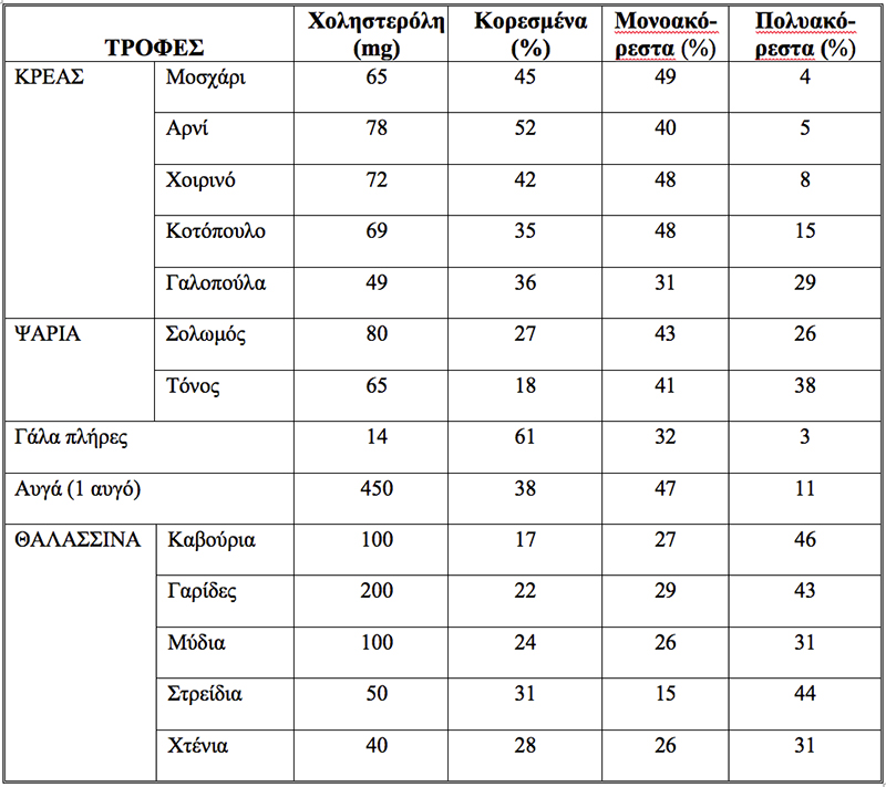 Η χοληστερόλη της τροφής προέρχεται από τα ζωικά προϊόντα. Η μεγαλύτερη ποσότητα χοληστερόλης περιέχεται στα ζωικά όργανα (το εσωτερικό του εγκεφάλου, το πάγκρεας, τα νεφρά, το ήπαρ). Το κρέας δεν περιέχει μεγάλη ποσότητα χοληστερόλης, αλλά επειδή η ημερήσια κατανάλωσή του είναι μεγάλη, συμμετέχει σημαντικά στην ημερήσια πρόσληψη της χοληστερόλης. Τα κορεσμένα λιπαρά οξέα όπως και η διατροφική χοληστερόλη αυξάνουν τα επίπεδα της ολικής χοληστερόλης και των τριγλυκεριδίων.