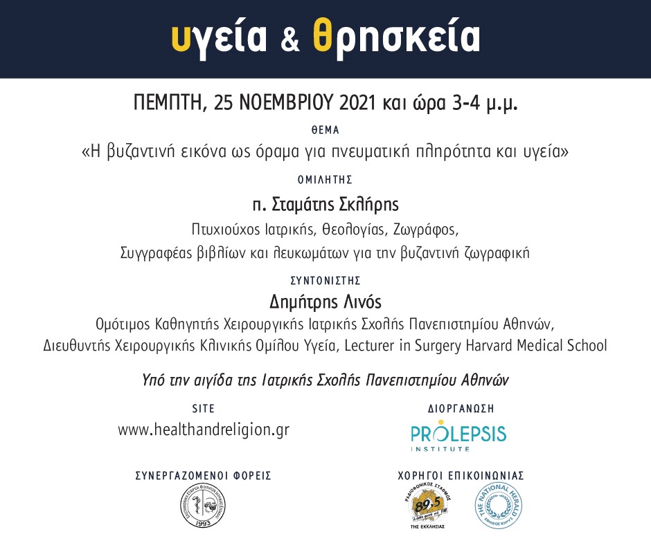 Την Πέμπτη 25 Νοεμβρίου 2021 και ώρα 15:00 – 16:00, θα πραγματοποιηθεί η 3η ομιλία του κύκλου διαδικτυακών μαθημάτων «Υγεία και Θρησκεία», τα οποία επιμελείται και συντονίζει ο Ομότιμος Καθηγητής της Χειρουργικής Δημήτρης Λινός.