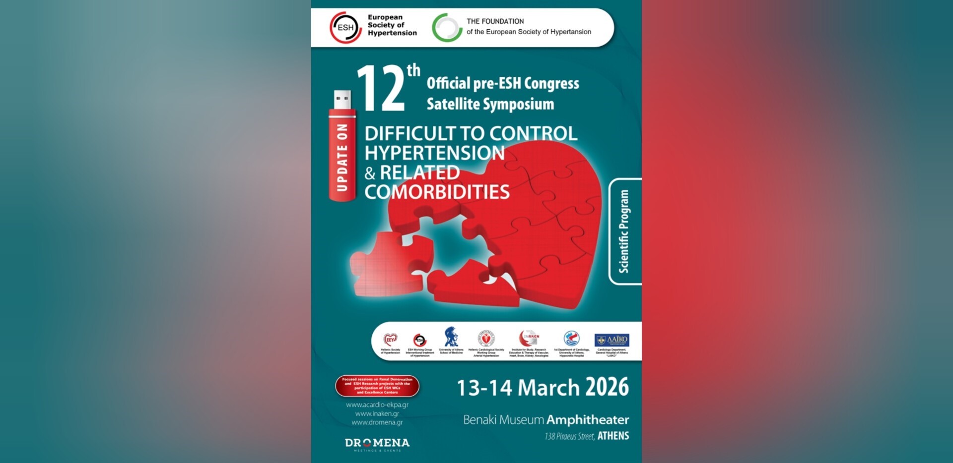 Το επιστημονικό αυτό συνέδριο, που διοργανώνεται στο πλαίσιο των εργασιών του Ετήσιου Συνεδρίου της Ευρωπαϊκής Εταιρείας Υπέρτασης (ESH), συγκεντρώνει κορυφαίους ειδικούς στους τομείς της καρδιολογίας, της υπέρτασης, της νεφρολογίας και της αγγειακής ιατρικής, με στόχο την παρουσίαση των πιο πρόσφατων επιστημονικών εξελίξεων στη διάγνωση και αντιμετώπιση της δύσκολα ρυθμιζόμενης υπέρτασης.