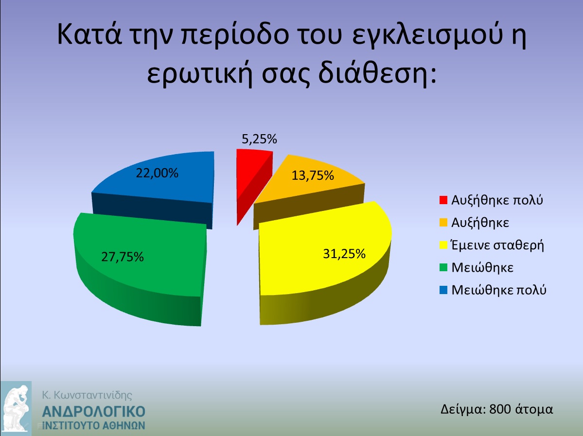 Σύμφωνα με πρόσφατη έρευνα του Ανδρολογικού Ινστιτούτου, την περίοδο εγκλεισμού που διανύουμε σε δείγμα 2.000 ατόμων, η ερωτική διάθεση μειώθηκε πολύ σε ποσοστό 22%, απλά μειώθηκε στο 27,75%, ενώ έμεινε σταθερή στο 31,25%. Αύξηση της ερωτικής διάθεση δήλωσε το 13,75% και μεγάλη αύξηση μόνο το 5,25%.