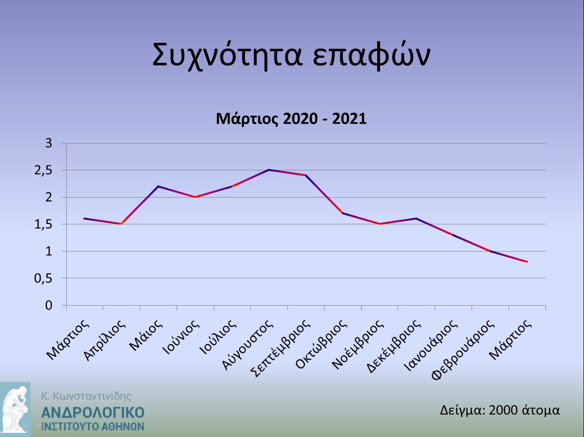 Η σύγκριση αυτών των μελετών με τη μορφή μιας καμπύλης με τα πάνω και τα κάτω της  έδειξε πως η κυματοειδής αυτή συχνότητα των ερωτικών πράξεων του πληθυσμού,  ενώ ξεκίνησε με τον πρώτο εγκλεισμό στα ψηλά, κατέβηκε και σταθεροποιήθηκε χαμηλά στο τελευταίο lockdown. Έγινε μια ευθεία σταθερή και χαμηλή χωρίς εξάρσεις δηλαδή».