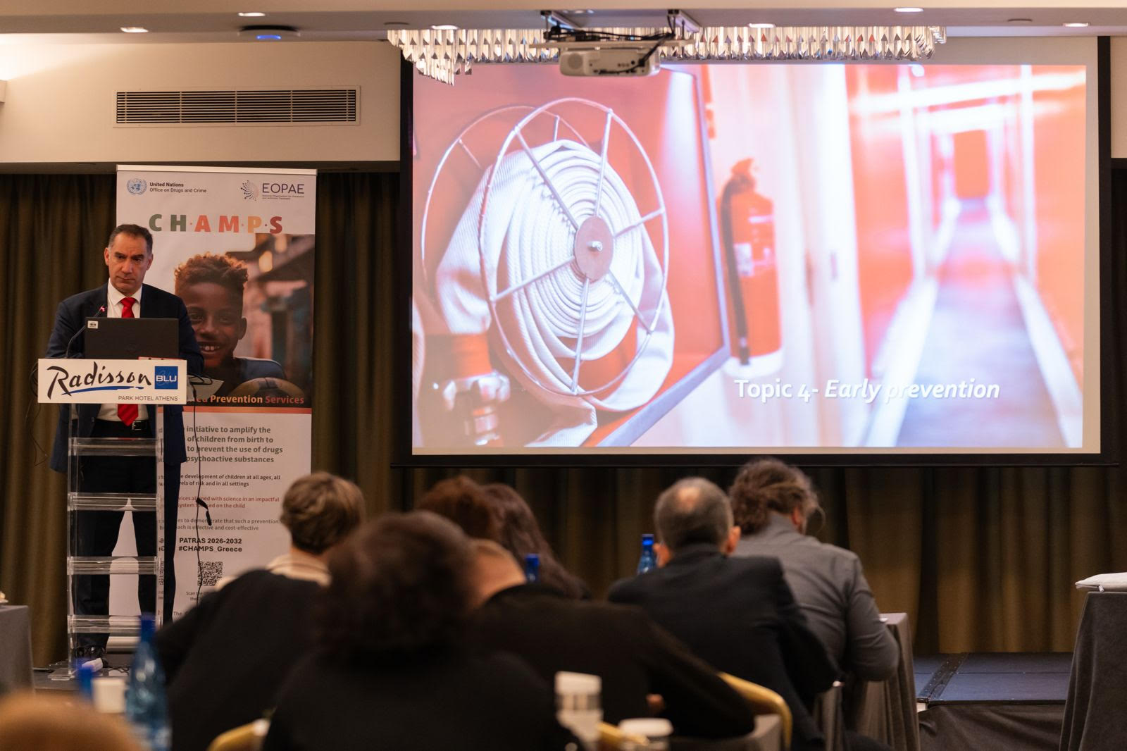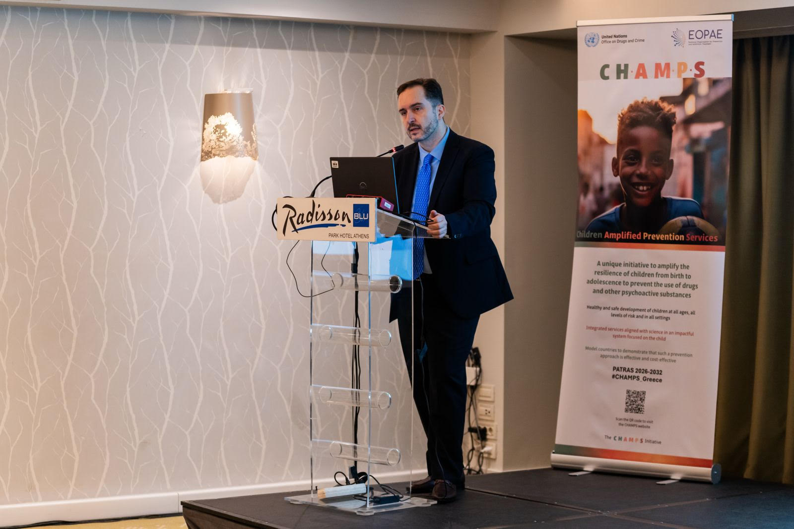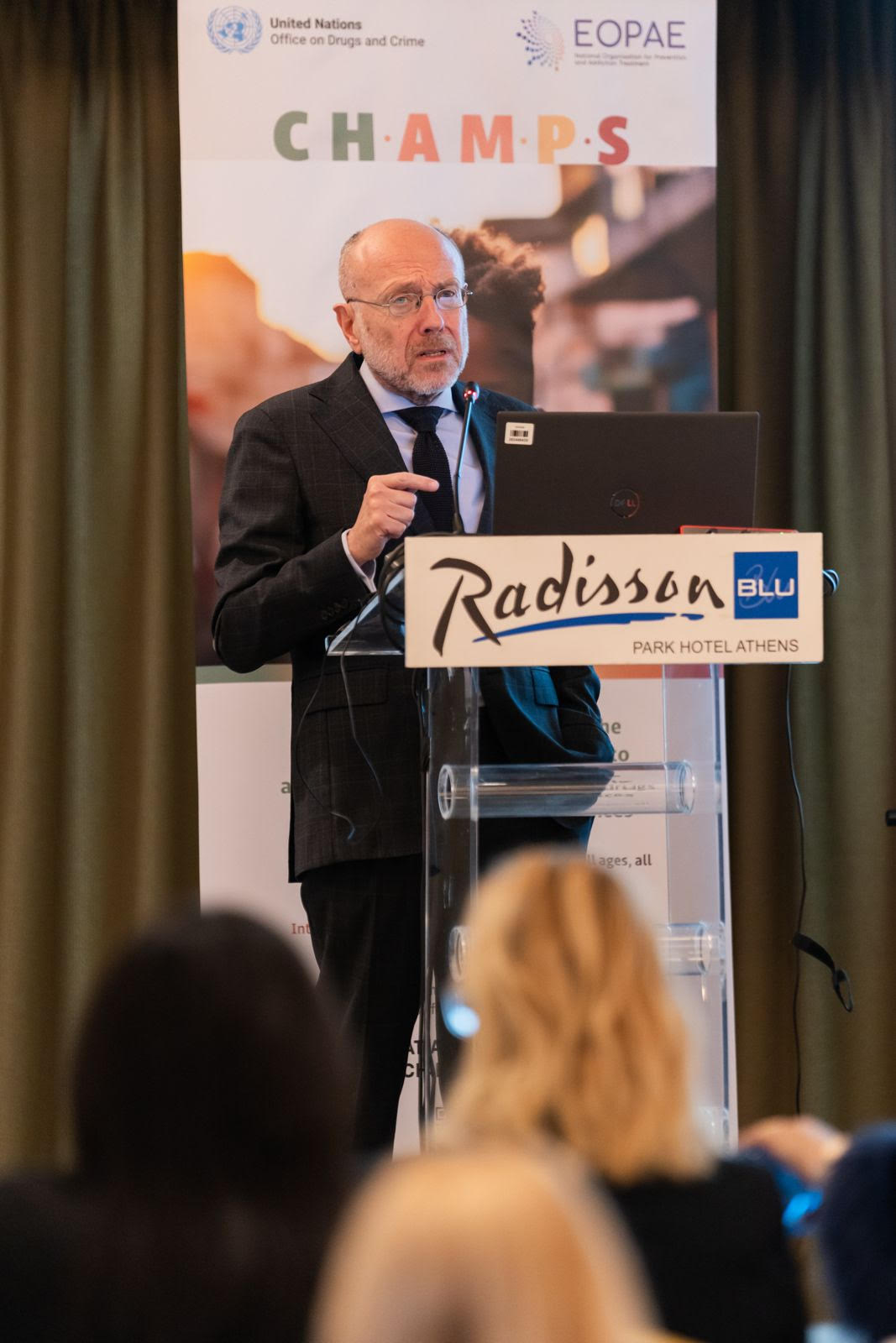 Κεντρικός ομιλητής ήταν ο Dr. Wadih Maalouf, Παγκόσμιος Συντονιστής Προγραμμάτων Πρόληψης του UNODC, ο οποίος παρουσίασε τη φιλοσοφία, τη δομή και τη στρατηγική σημασία του CHAMPS.