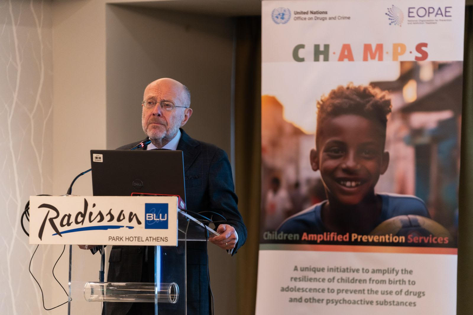 Ο Εθνικός Συντονιστής για την Αντιμετώπιση των Εξαρτήσεων και Πρόεδρος του ΕΟΠΑΕ κ. Αθανάσιος Θεοχάρης σημείωσε την αναγκαιότητα για θεσμική, σύγχρονη, επιστημονικά τεκμηριωμένη προσέγγιση στην πρόληψη, τονίζοντας χαρακτηριστικά ότι «Το CHAMPS δεν είναι απλώς ένα ακόμη πρόγραμμα αποτελεί μια ουσιαστική αλλαγή του προτύπου Πρόληψης που εφαρμοζόταν μέχρι σήμερα. Αποτελεί στρατηγική επιλογή πρόληψης. Απώτερος στόχος του είναι η ενίσχυση της ψυχικής, κοινωνικής και συναισθηματικής ανθεκτικότητας των παιδιών από τη γέννηση έως και την εφηβεία, με σκοπό την πρόληψη της χρήσης εξαρτησιογόνων ουσιών και άλλων συμπεριφορών υψηλού κινδύνου. Τα παιδιά πλέον δεν αντιμετωπίζονται ως παθητικοί αποδέκτες παρεμβάσεων, αλλά ως ενεργοί συμμέτοχοι, ως οι αυριανοί «πρωταθλητές», ως οι αυριανοί “CHAMPS”.»
