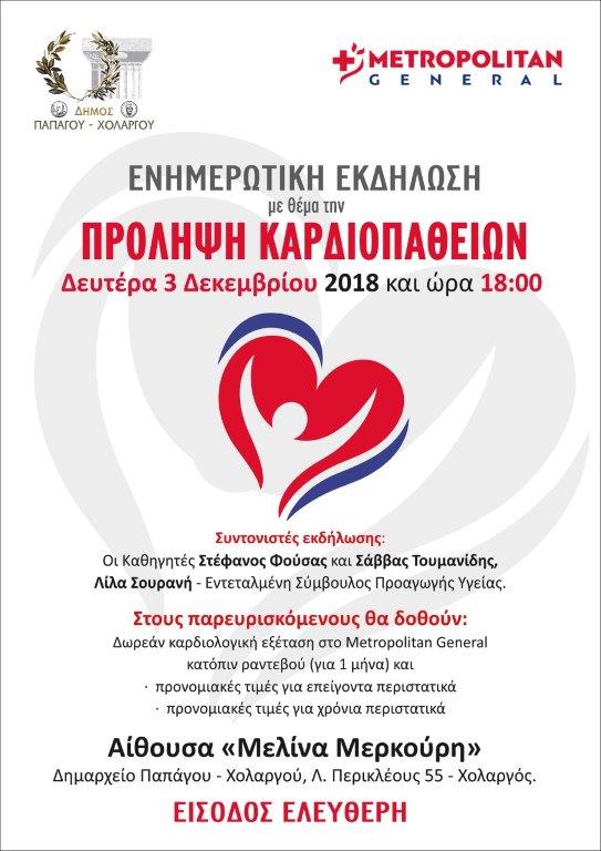 Ο Δήμος Παπάγου – Χολαργού και οι «Γιατροί της καρδιάς μας» του Metropolitan General, διοργανώνουν εκδήλωση ενημέρωσης για την πρόληψη καρδιοπαθειών, τη Δευτέρα 3 Δεκεμβρίου και ώρα 18:00, στην αίθουσα «Μ. Μερκούρη», του δημαρχείου Παπάγου – Χολαργού.