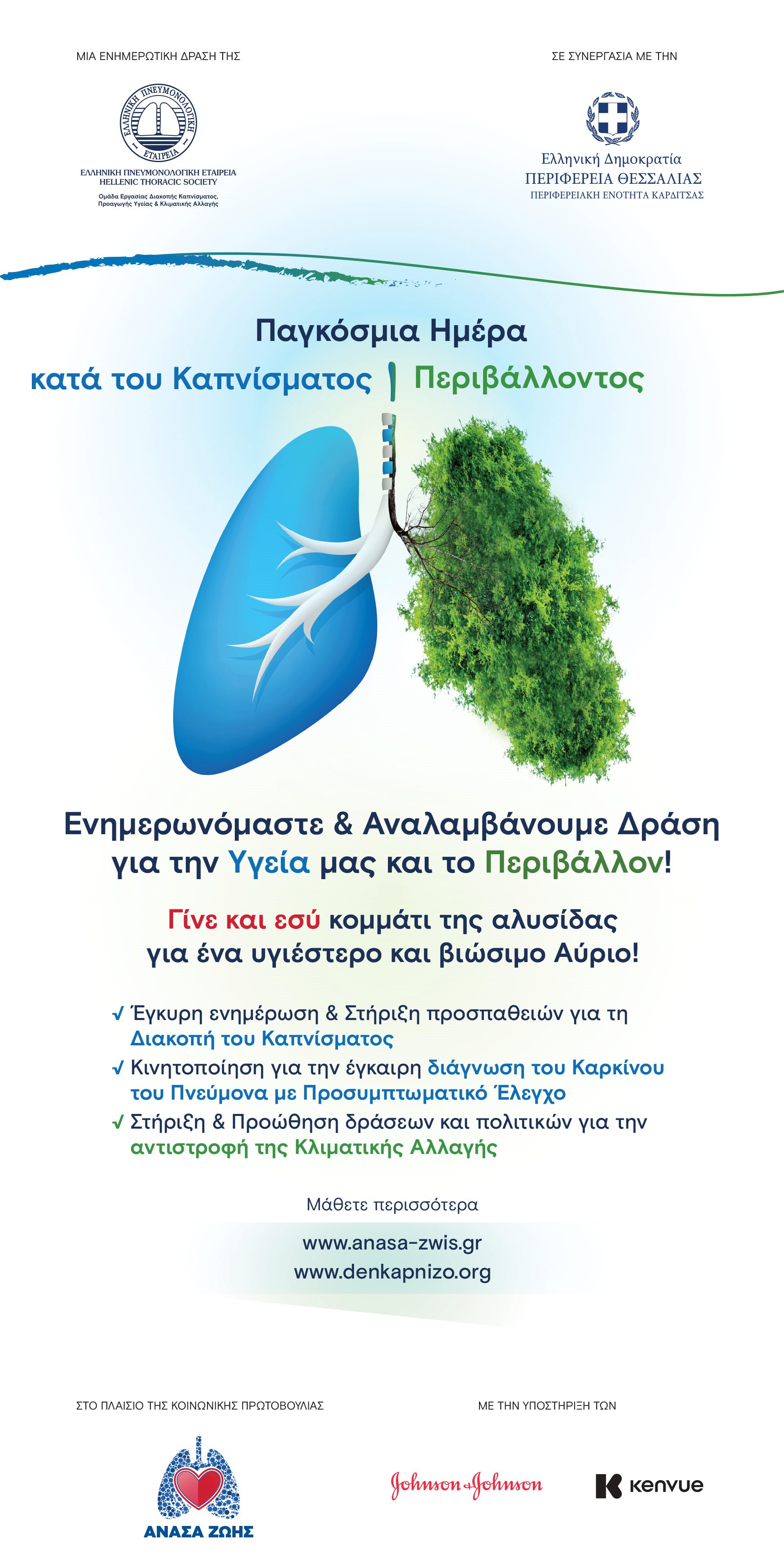 Μια κοινή ενημερωτική εκδήλωση με αφορμή την Παγκόσμια Ημέρα κατά του Καπνίσματος (31/05) και την Παγκόσμια Ημέρα Περιβάλλοντος (5/06) υλοποίησαν η Ελληνική Πνευμονολογική Εταιρεία και η Περιφέρεια Θεσσαλίας στην πόλη της Καρδίτσας με το μήνυμα «Ενημερωνόμαστε & Αναλαμβάνουμε Δράση για την Υγεία μας και το Περιβάλλον!».