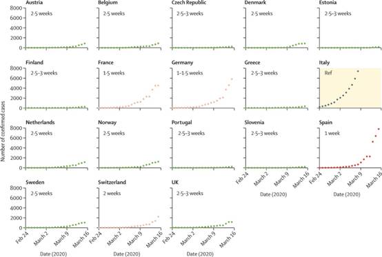 Ο νέος κορωνοϊός SARS-CoV-2 έχει πλέον παγκόσμια εξάπλωση και στις 11 Μαρτίου 2020 ο ΠΟΥ τον χαρακτήρισε ως πανδημία. Η Ευρώπη βρίσκεται στο επίκεντρο με την Ιταλία και την Ισπανία να μετράνε περισσότερους θανάτους πλέον από την Κίνα. Η συρροή μεγάλου αριθμού κρουσμάτων σε σύντομο χρονικό διάστημα δοκιμάζει το ιταλικό σύστημα υγείας καθώς η ανάγκη για κλίνες εντατικής θεραπείας ξεπερνά κατά πολύ τη διαθεσιμότητα. Η ιταλική κυβέρνηση εισήγαγε προοδευτικά μέτρα στις 9 Μαρτίου και 11 Μαρτίου 2020, για να περιορίσει δραστικά τις κοινωνικές αλληλεπιδράσεις και να προλάβει την εξάπλωση του ιού. Σύμφωνα με τα επιδημιολογικά χαρακτηριστικά της λοίμωξης μέχρι τις 8 Μαρτίου, επιδημιολογικό μοντέλου προέβλεπε περισσότερα από 30.000 περιστατικά μέχρι τις 15 Μαρτίου 2020. Τα καταγεγραμμένα περιστατικά σύμφωνα με το  Πανεπιστήμιο Johns Hopkins στις 15 Μαρτίου 2020 ήταν 24.747, γεγονός που υποδηλώνει ότι τα μέτρα που θεσπίστηκαν στις 11 Μαρτίου 2020 άρχισαν να μειώνουν τον αριθμό των νέων περιπτώσεων εντός 3-4 ημερών, σύμφωνα με τους Saglietto και συνεργάτες, The Lancet, 23Mar2020. Όλες οι άλλες Ευρωπαϊκές χώρες φαίνεται να βρίσκονται σε αντίστοιχη κατάσταση, αλλά με καθυστέρηση μερικών εβδομάδων συγκριτικά με την Ιταλία (Εικόνα). Οι Saglietto et al τονίζουν ότι όλες οι χώρες πρέπει να λάβουν σοβαρά υπόψη την πορεία της Ιταλίας και να λάβουν δραστικότατα μέτρα κοινωνικής απομόνωσης ώστε να μειωθεί η εξάπλωση της λοίμωξης, να διασφαλίσουν την αποτελεσματική αντίδραση των συστημάτων υγείας και να μειώσουν τη θνησιμότητα που στην Ιταλία ανέρχεται στο 4%.