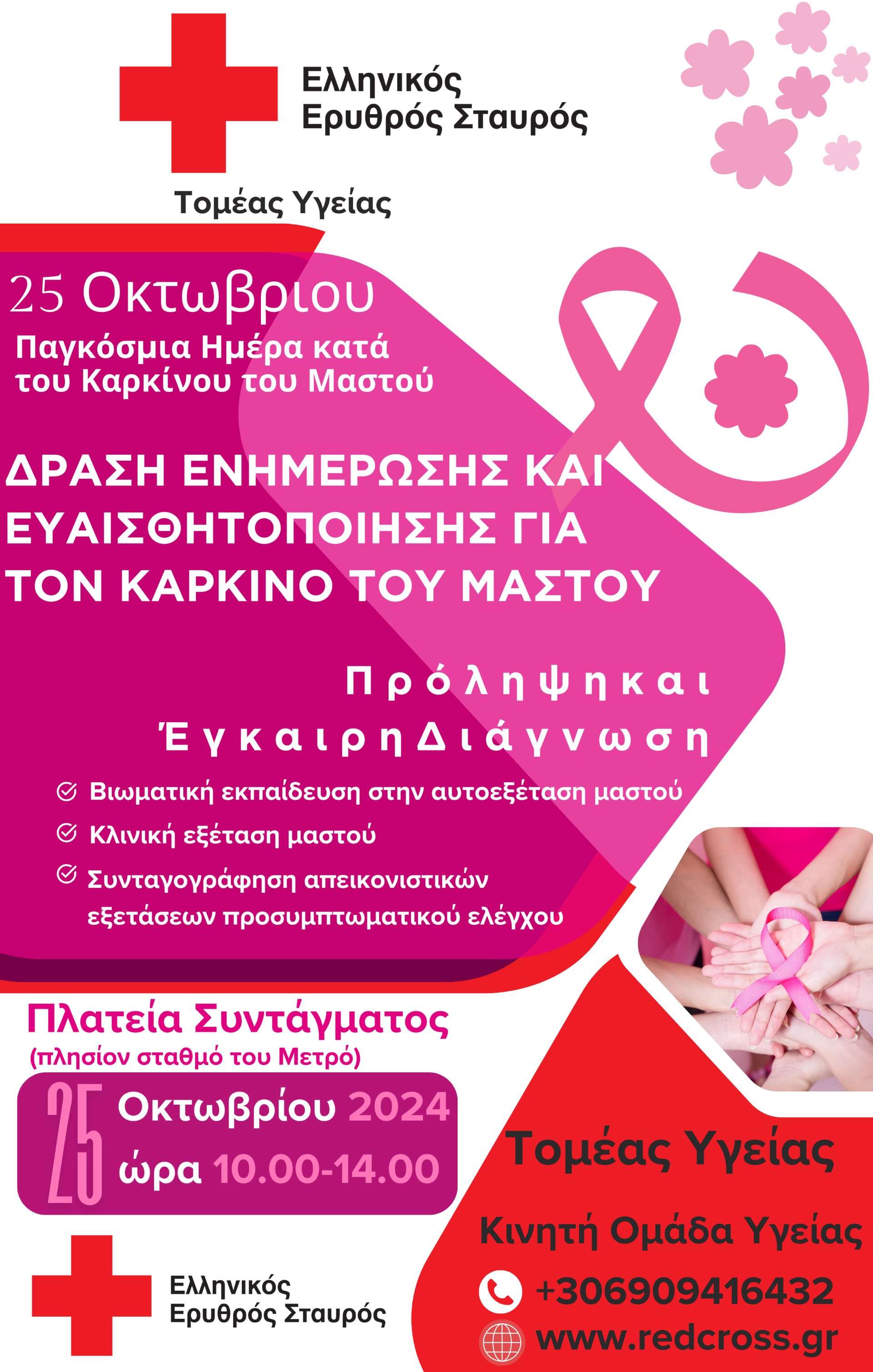 Ο Ελληνικός Ερυθρός Σταυρός (ΕΕΣ), με την ευγενική υποστήριξη του Δήμου Αθηναίων διοργανώνει ανοιχτή εκδήλωση Ενημέρωσης και Ευαισθητοποίησης για την πρόληψη και την πρώιμη ανίχνευση του γυναικείου καρκίνου στην πλατεία Συντάγματος (πλησίον σταθμό του Μετρό), την Παρασκευή 25 Οκτωβρίου 2024 και ώρα 10:00 – 14:00.