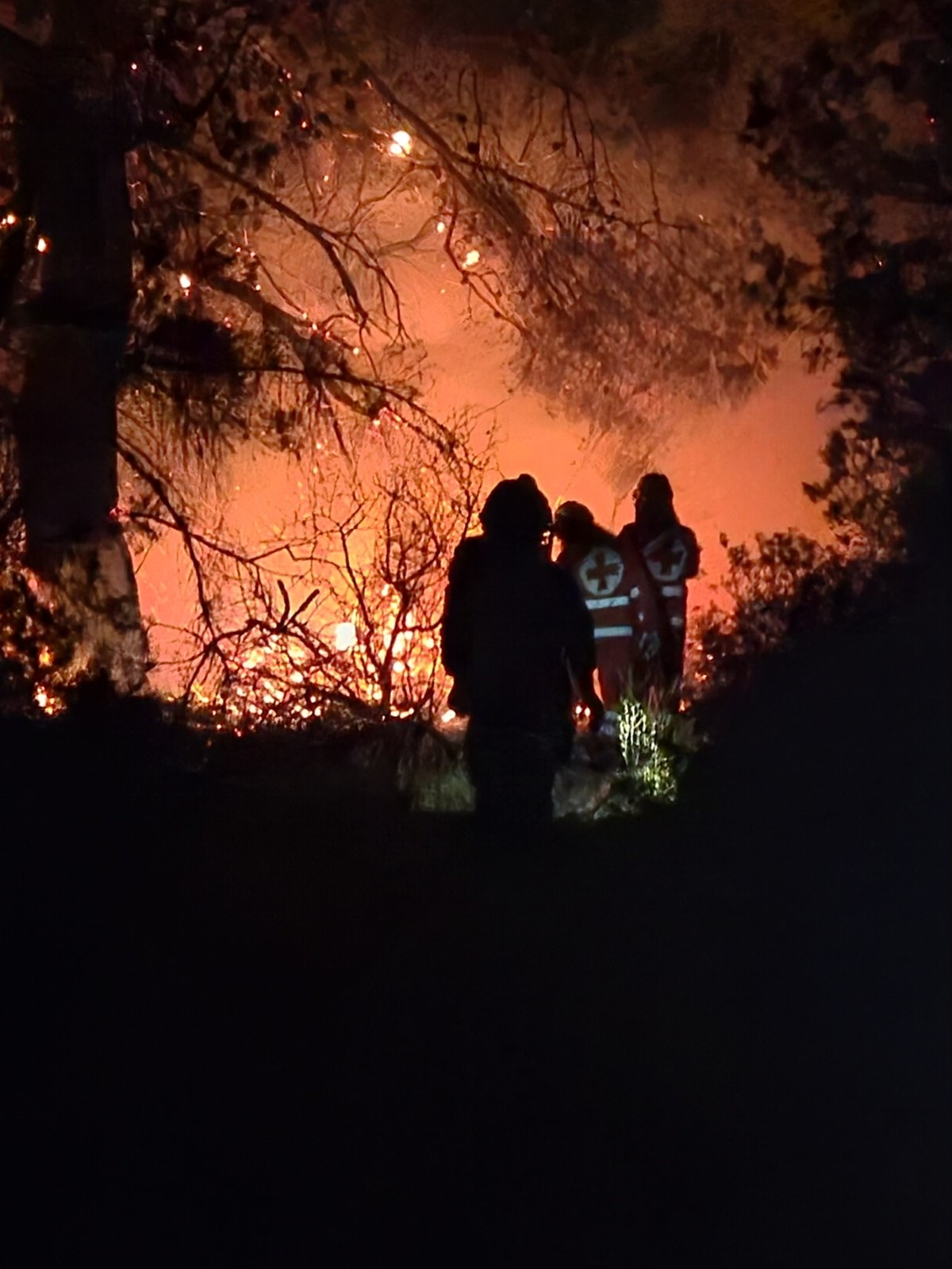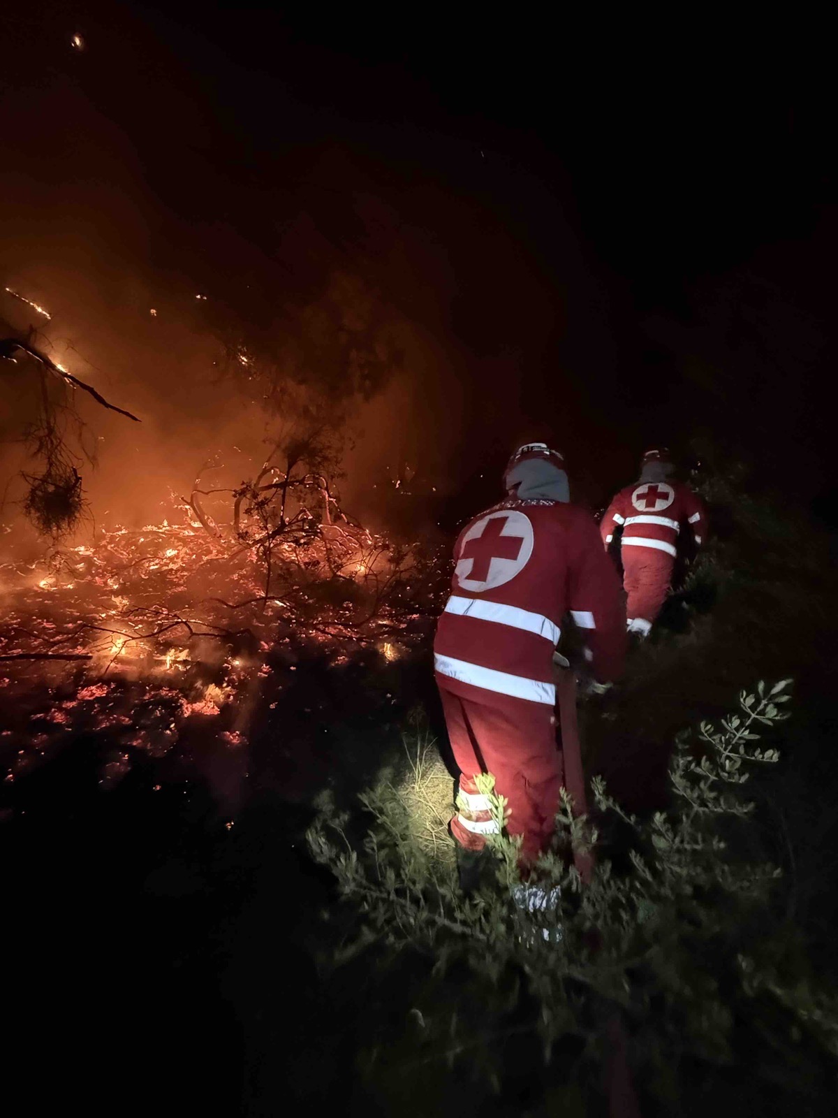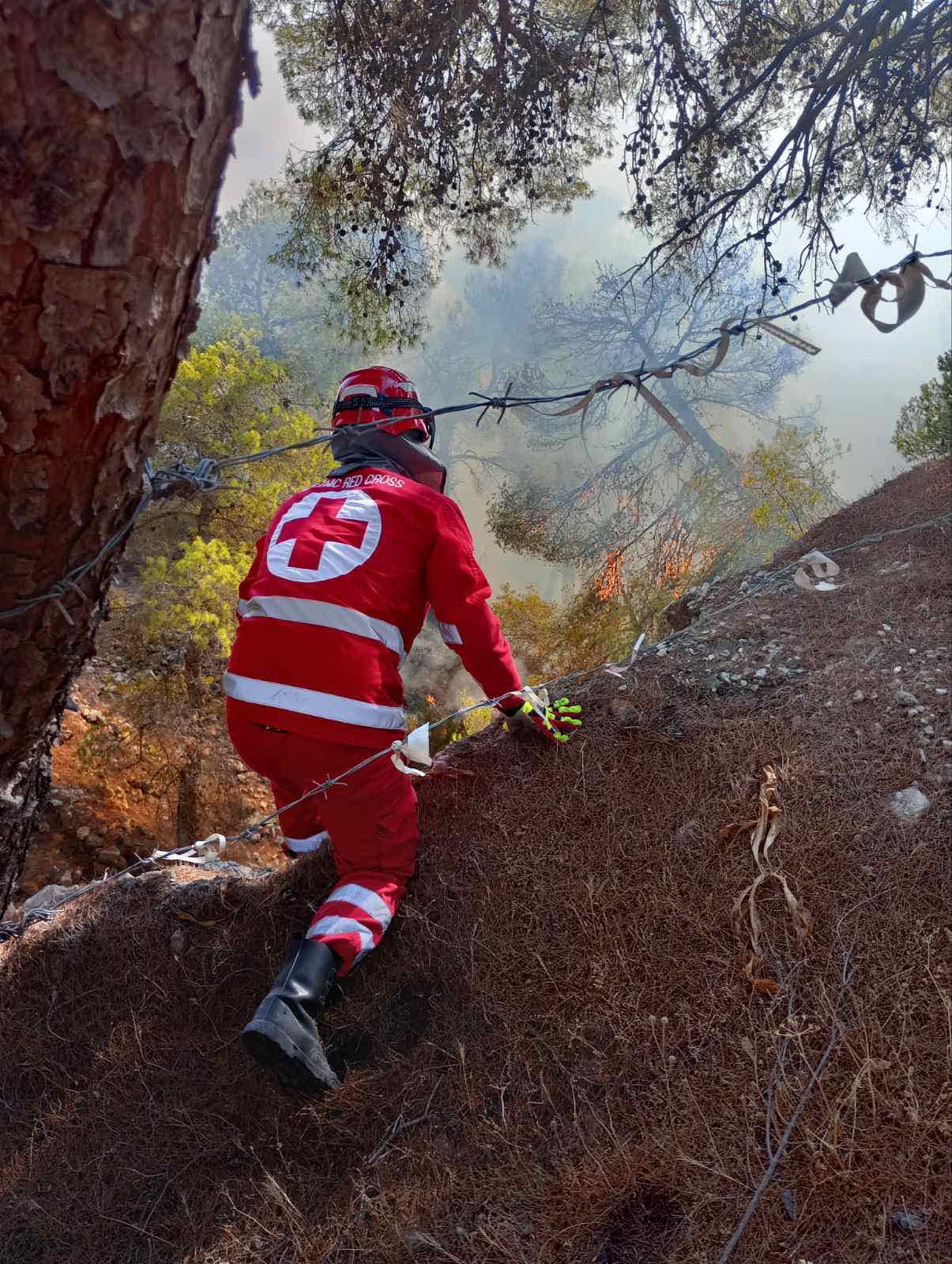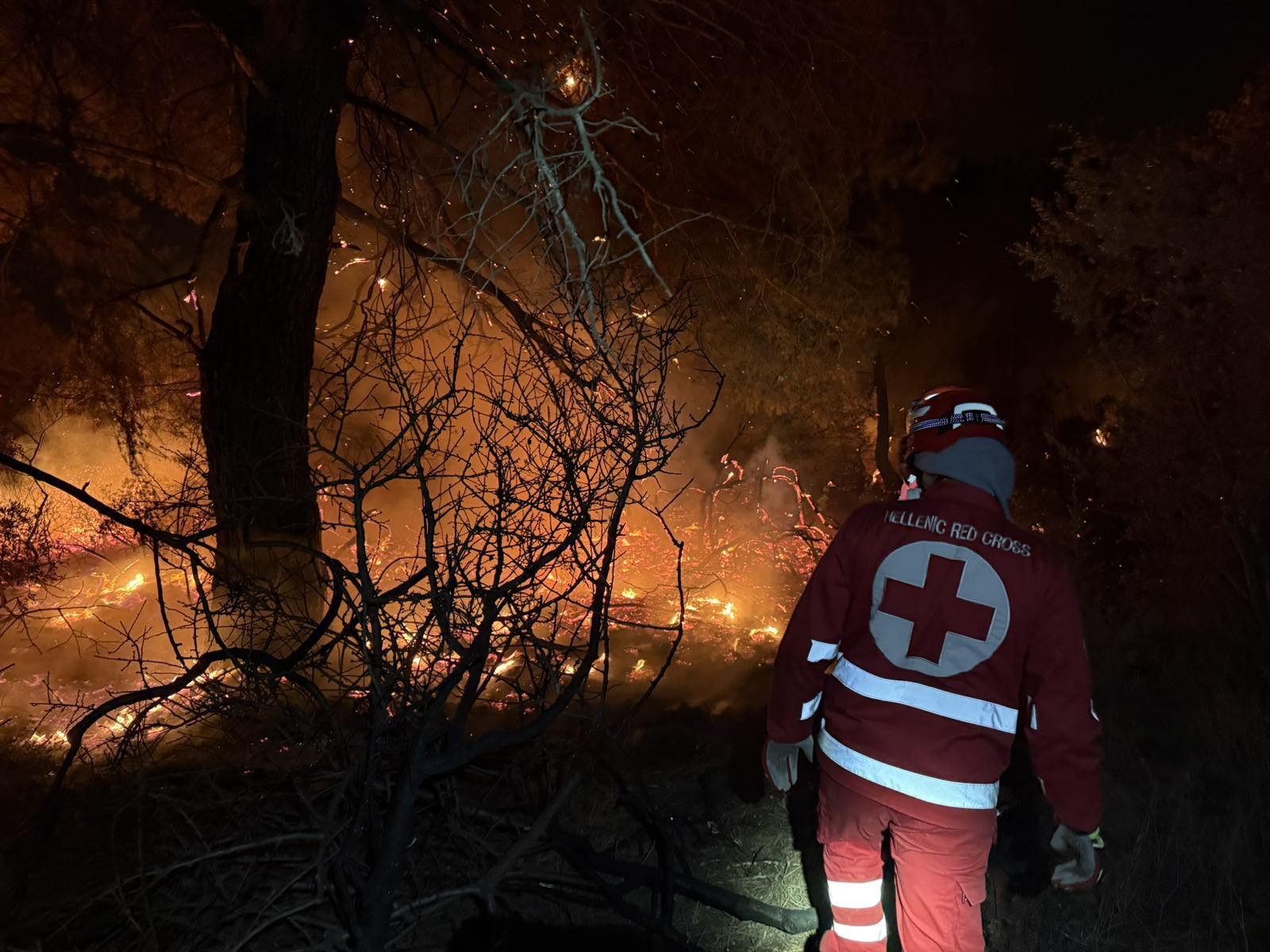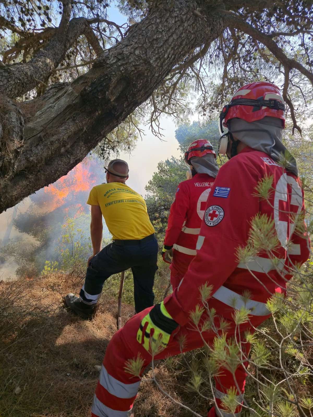 Οι έμπειροι διασώστες του Ελληνικού Ερυθρού Σταυρού ενίσχυσαν το δύσκολο έργο της κατάσβεσης, προσφέροντας παράλληλα πρώτες βοήθειες σε πυροσβέστες και πολίτες που είχαν υποστεί ελαφρά εγκαύματα από τη συνεχή μάχη με τις φλόγες. Ταυτόχρονα, κλιμάκια εθελοντών, σε συνεργασία με τις Αρχές, ενημέρωναν πόρτα πόρτα τους κατοίκους για εκκένωση στις περιοχές που απειλούνταν άμεσα από τις φλόγες.