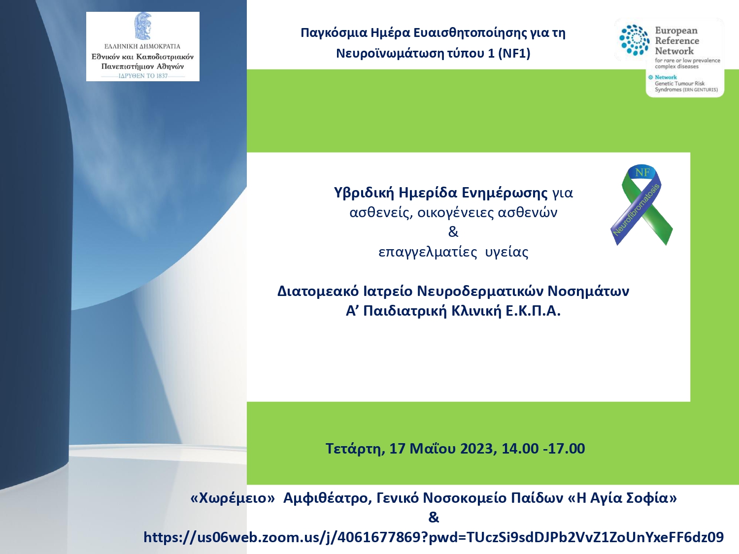 Η ομάδα του Διατομεακού Ιατρείου Νευροδερματικών Νοσημάτων και η Α’ Παιδιατρική Κλινική του Εθνικού και Καποδιστριακού Πανεπιστημίου Αθηνών του Γενικού Νοσοκομείου Παίδων «Η Αγία Σοφία» σας προσκαλεί στην «Ημερίδα ενημέρωσης για την Νευροϊνωμάτωση».