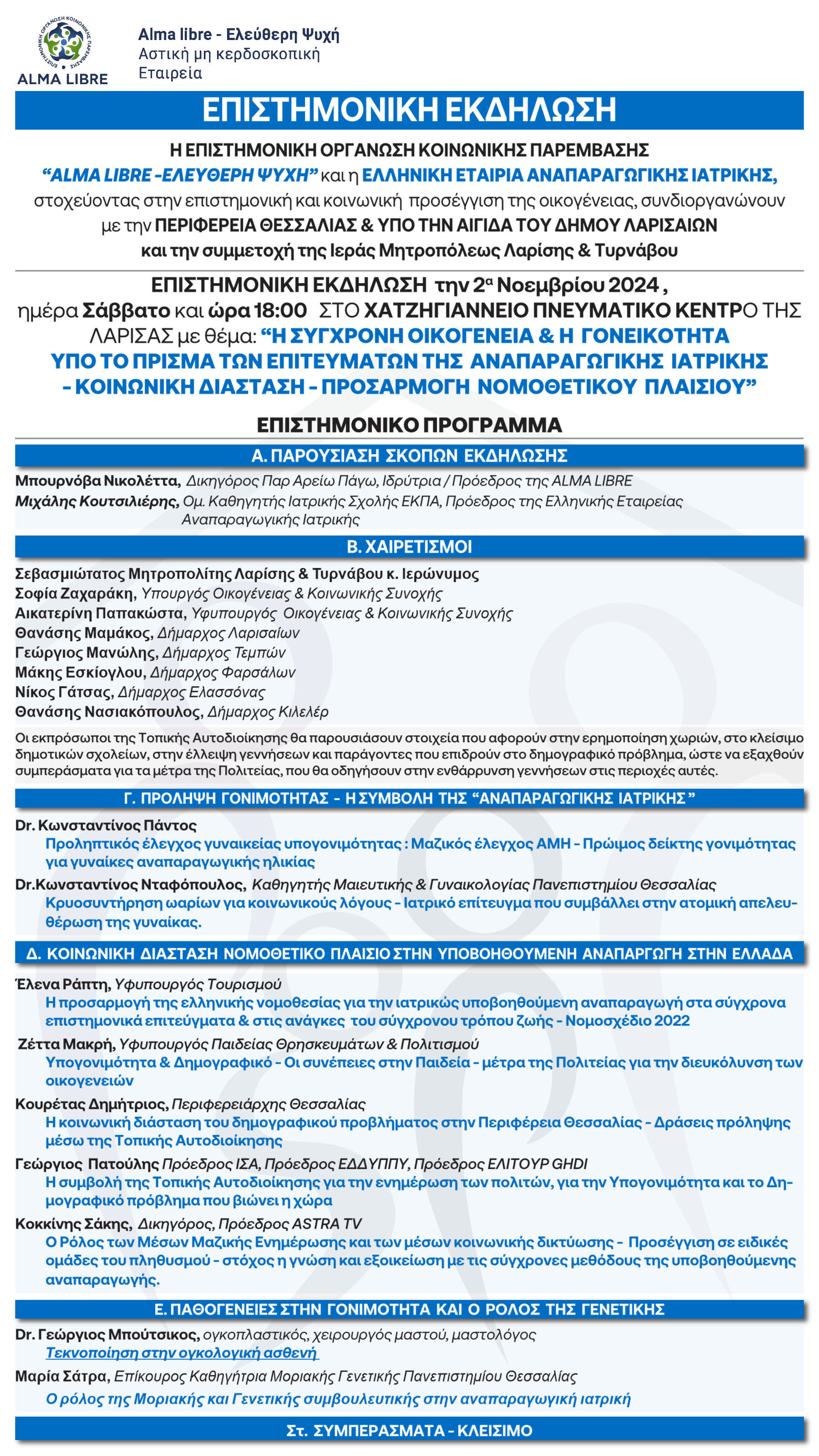 Η ΕΠΙΣΤΗΜΟΝΙΚΗ ΟΡΓΑΝΩΣΗ ΚΟΙΝΩΝΙΚΗΣ ΠΑΡΕΜΒΑΣΗΣ “ALMA LIBRE – ΕΛΕΥΘΕΡΗ ΨΥΧΗ” και η ΕΛΛΗΝΙΚΗ ΕΤΑΙΡΕΙΑ ΑΝΑΠΑΡΑΓΩΓΙΚΗΣ ΙΑΤΡΙΚΗΣ, συνδιοργανώνουν με την ΠΕΡΙΦΕΡΕΙΑ ΘΕΣΣΑΛΙΑΣ και υπό την αιγίδα του ΔΗΜΟΥ ΛΑΡΙΣΑΙΩΝ, επιστημονική εκδήλωση με θέμα: “Η σύγχρονη οικογένεια και η γονεϊκότητα υπό το πρίσμα των επιτευγμάτων της αναπαραγωγικής ιατρικής – κοινωνική διάσταση – προσαρμογή νομοθετικού πλαισίου”.
