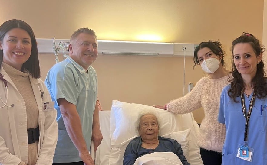 Η 100χρονη κα Άννα Λαζαρίδου με την ομάδα της Β΄ Καρδιολογικής Κλινικής του Ερρίκος Ντυνάν μετά την επέμβαση στην οποία υποβλήθηκε για αντικατάσταση στενωμένης αορτικής βαλβίδας