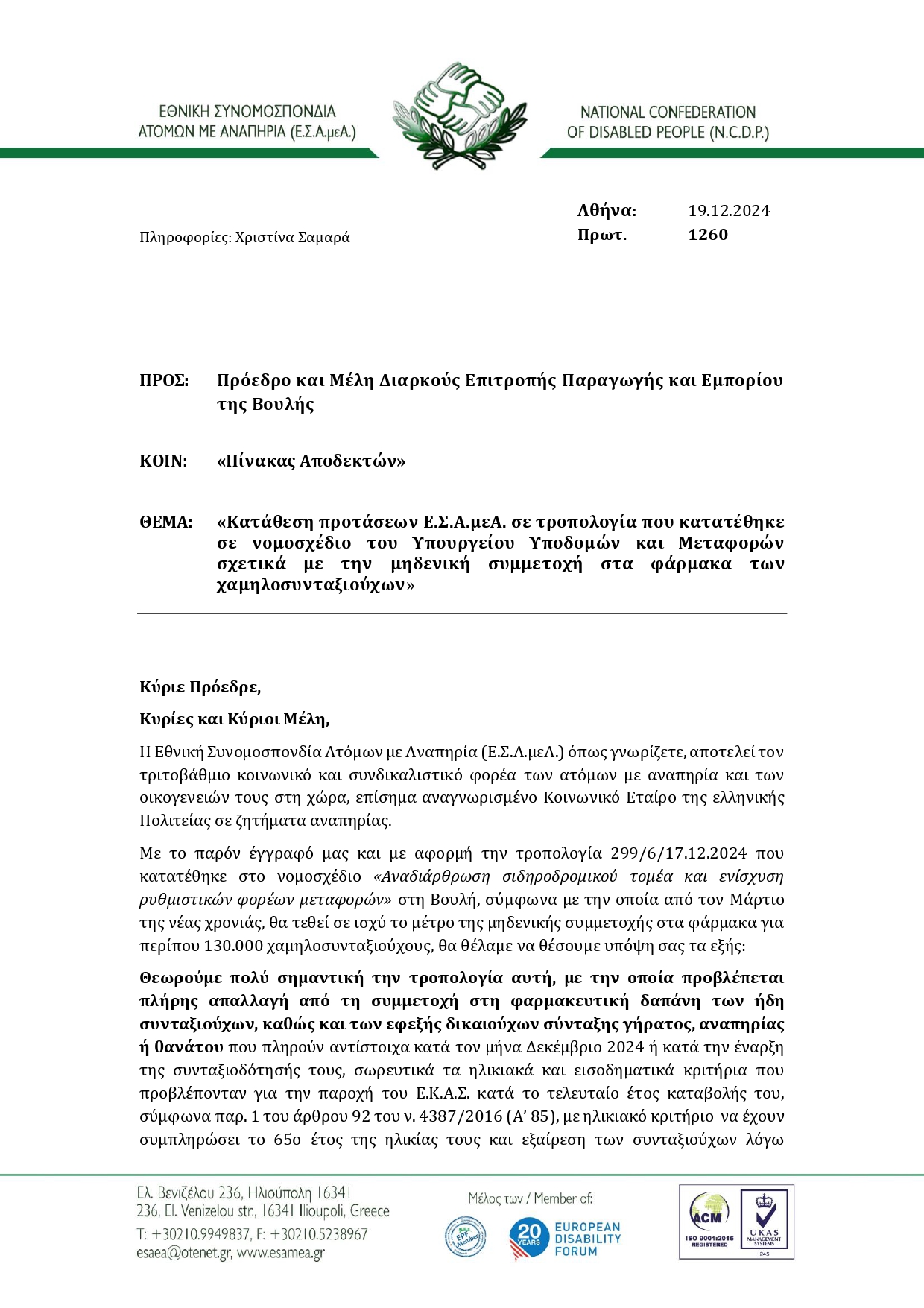 Επιστολή ΕΣΑμεΑ