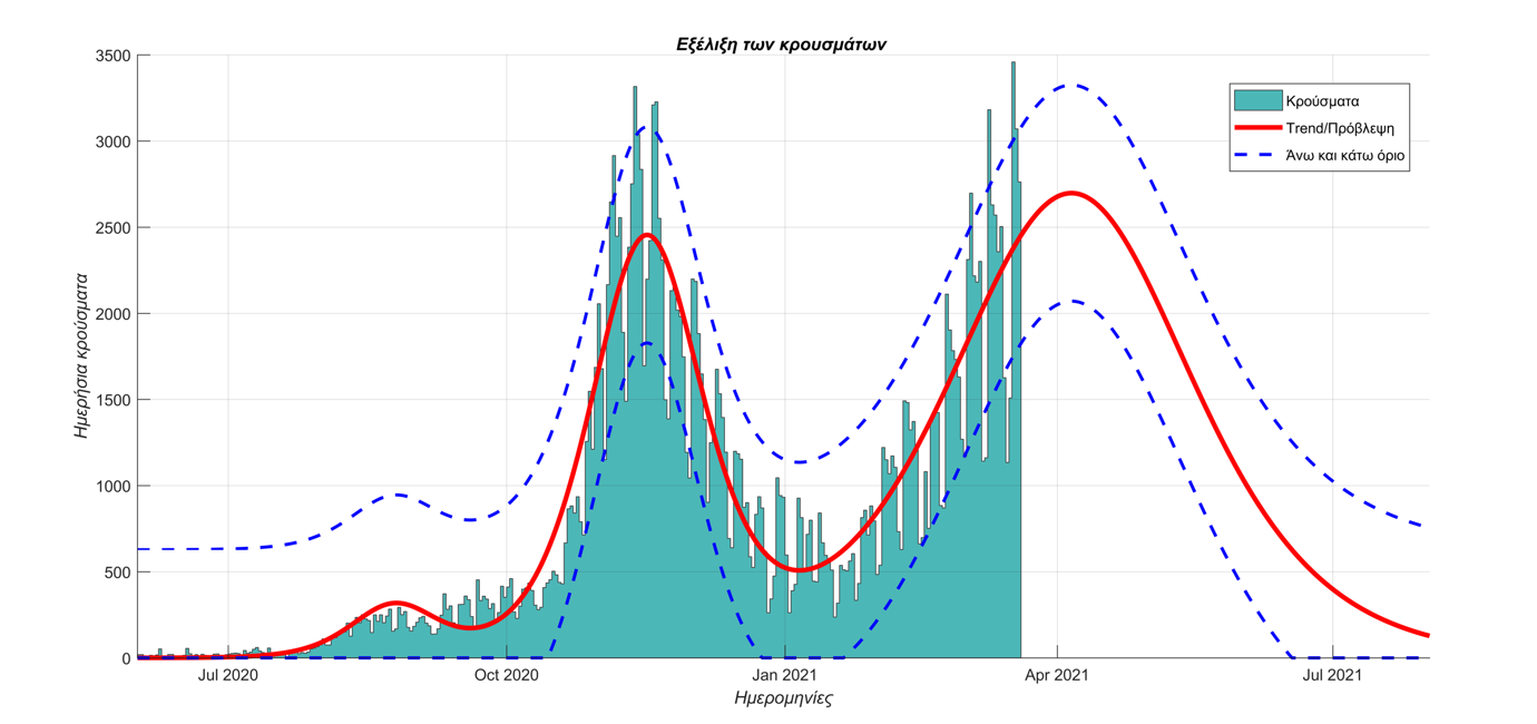 Τα παραπάνω επιβεβαιώνουν την ανάλυση της 24/3/2021 η οποία δημοσιεύθηκε στο τύπο όπου είχαμε προβλέψει την κορύφωση των κρουσμάτων το πρώτο 10ήμερο του Απριλίου και τον έλεγχο το παρόντος κύματος της πανδημίας τον Ιούλιο.