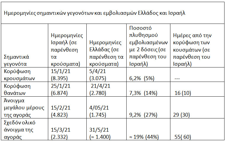 Άνοιγμα μεγάλου μέρους της αγοράς για το Ισραήλ επήλθε 15/2/2021 με 4.823 κρούσματα και με εμβολιασμένο το 27% του πληθυσμού 30 ημέρες μετά την κορύφωση των κρουσμάτων. Στην χώρα μας επήλθε 4/5/21 με 1.745 κρούσματα και με εμβολιασμένο το 9,2% του πληθυσμού 29 ημέρες μετά την κορύφωση των κρουσμάτων.