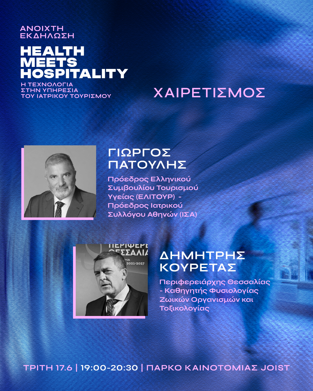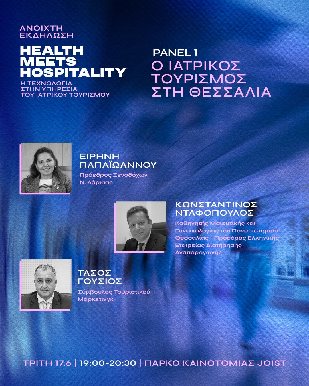 Με φόντο τις ταχύτατα αναπτυσσόμενες προοπτικές του ιατρικού τουρισμού στην Ελλάδα και ειδικότερα στη Θεσσαλία, το Πάρκο Καινοτομίας JOIST και ο Ευρωπαϊκός Κόμβος Ψηφιακής Καινοτομίας Health Hub συνδιοργανώνουν την εκδήλωση Health Meets Hospitality: Η Τεχνολογία στην Υπηρεσία του Ιατρικού Τουρισμού την Τρίτη 17 Ιουνίου, στις 19:00, στο JOIST Innovation Park, στη Λάρισα.