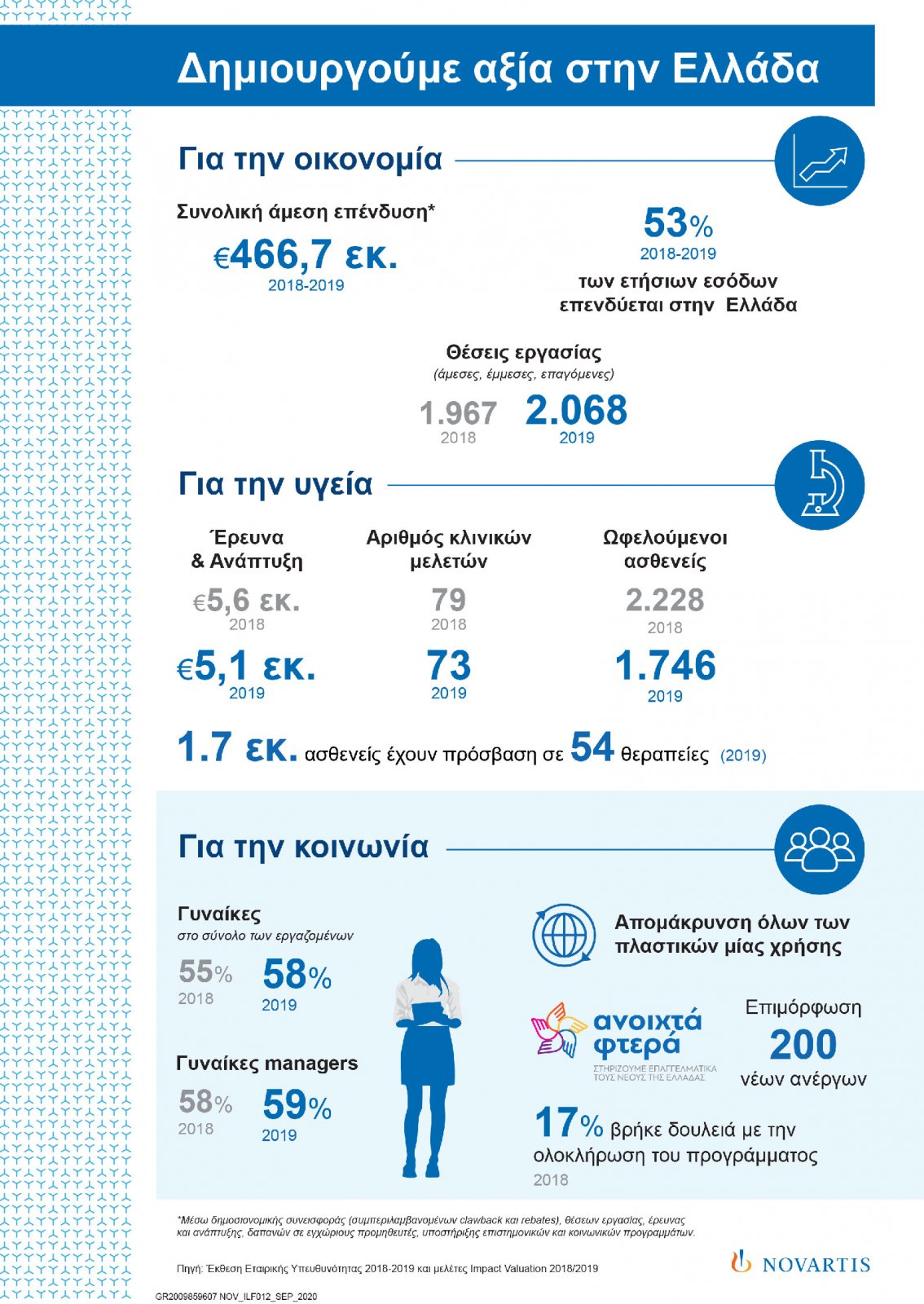 Με βάση τις παραπάνω προτεραιότητες, η Novartis Hellas επένδυσε στην εθνική οικονομία το 53% των συνολικών της εσόδων κατά την διετία 2018-2019. Ειδικότερα, η εταιρεία προχώρησε σε συνολικές άμεσες επενδύσεις που αγγίζουν τα €467 εκ., μέσω δημοσιονομικής συνεισφοράς (συμπεριλαμβανομένων clawback και rebates), θέσεων εργασίας, έρευνας και ανάπτυξης, δαπανών σε εγχώριους προμηθευτές, υποστήριξης επιστημονικών και κοινωνικών προγραμμάτων. Επιπλέον, η εταιρεία δημιούργησε 1.967 και 2.068 άμεσες, έμμεσες και επαγόμενες θέσεις εργασίας το 2018 και 2019 αντίστοιχα*.