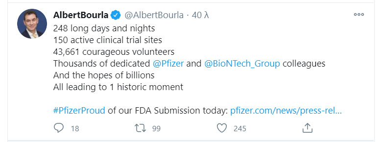 Ο Πρόεδρος και Διευθύνων Σύμβουλος της Pfizer, Άλμπερτ Μπουρλά σε ανάρτησή του στο Twitter έκανε λόγο για ιστορική στιγμή. “248 μεγάλες μέρες και νύχτες. 150 ενεργές περιοχές κλινικών δοκιμών. 43.661 θαρραλέοι εθελοντές. Χιλιάδες αφοσιωμένοι συνάδελφοι στη Pfizer και στην BioNTech. Και οι ελπίδες δισεκατομμυρίων, Όλα οδηγούν σε 1 ιστορική στιγμή” γράφει ο κ. Μπουρλά.