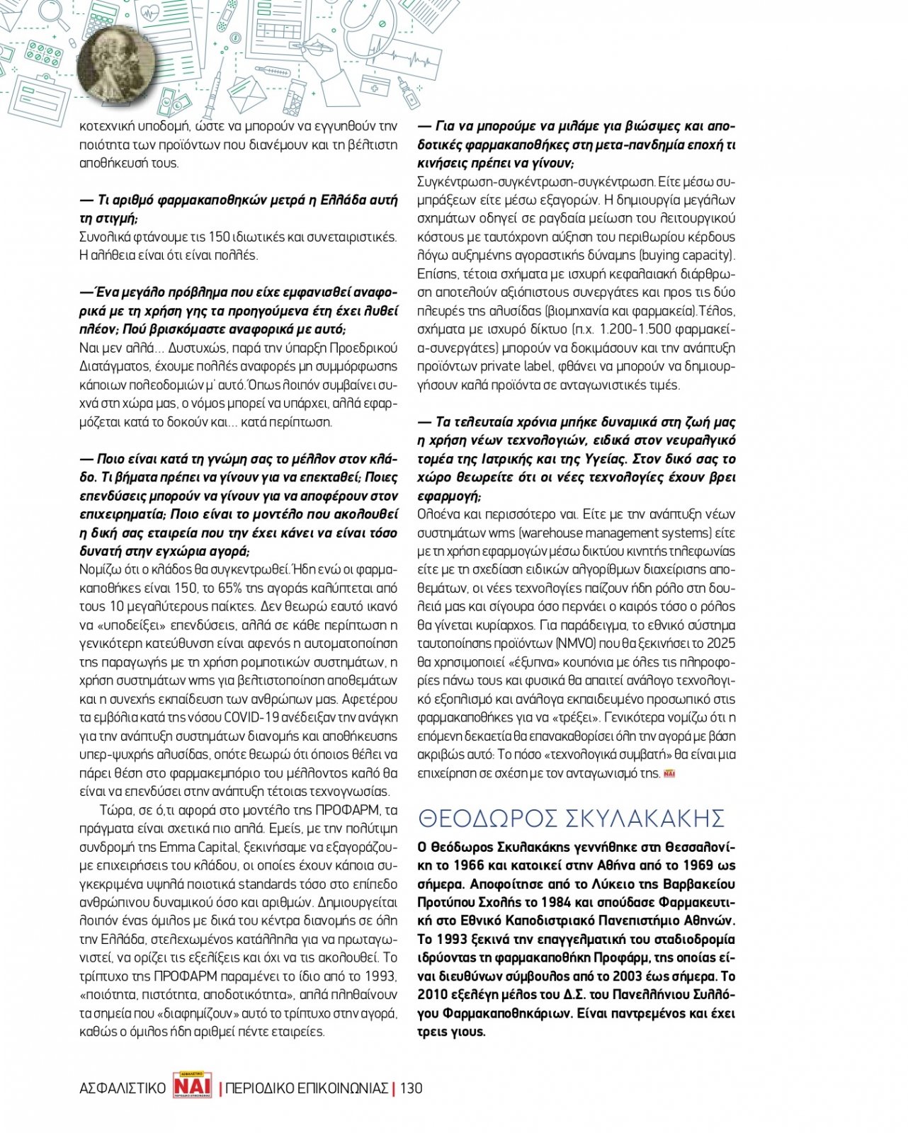 Νομίζω ότι ο κλάδος θα συγκεντρωθεί. Ήδη ενώ οι φαρμακαποθήκες είναι 150, το 65% της αγοράς καλύπτεται από τους 10 μεγαλύτερους παίκτες. Δεν θεωρώ εαυτό ικανό να «υποδείξει» επενδύσεις, αλλά σε κάθε περίπτωση η γενικότερη κατεύθυνση είναι αφενός η αυτοματοποίηση της παραγωγής με τη χρήση ρομποτικών συστημάτων, η χρήση συστημάτων wms για βελτιστοποίηση αποθεμάτων και η συνεχής εκπαίδευση των ανθρώπων μας. Αφετέρου τα εμβόλια κατά της νόσου COVID-19 ανέδειξαν την ανάγκη για την ανάπτυξη συστημάτων διανομής και αποθήκευσης υπερ-ψυχρής αλυσίδας, οπότε θεωρώ ότι όποιος θέλει να πάρει θέση στο φαρμακεμπόριο του μέλλοντος καλό θα είναι να επενδύσει στην ανάπτυξη τέτοιας τεχνογνωσίας. Τώρα, σε ό,τι αφορά στο μοντέλο της ΠΡΟΦΑΡΜ, τα πράγματα είναι σχετικά πιο απλά. Εμείς, με την πολύτιμη συνδρομή της Emma Capital, ξεκινήσαμε να εξαγοράζουμε επιχειρήσεις του κλάδου, οι οποίες έχουν κάποια συγκεκριμένα υψηλά ποιοτικά standards τόσο στο επίπεδο ανθρώπινου δυναμικού όσο και αριθμών. Δημιουργείται λοιπόν ένας όμιλος με δικά του κέντρα διανομής σε όλη την Ελλάδα, στελεχωμένος κατάλληλα για να πρωταγωνιστεί, να ορίζει τις εξελίξεις και όχι να τις ακολουθεί. Το τρίπτυχο της ΠΡΟΦΑΡΜ παραμένει το ίδιο από το 1993, «ποιότητα, πιστότητα, αποδοτικότητα», απλά πληθαίνουν τα σημεία που «διαφημίζουν» αυτό το τρίπτυχο στην αγορά, καθώς ο όμιλος ήδη αριθμεί πέντε εταιρείες.