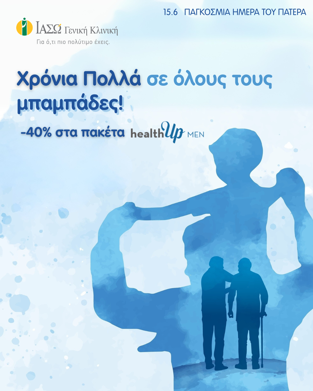 Με αφορμή την Παγκόσμια Ημέρα του Πατέρα, το ΙΑΣΩ Γενική Κλινική προσφέρει 40% έκπτωση στα πακέτα Check-Up healthUp ΜΕΝ, τιμώντας όλους τους μπαμπάδες, και υπενθυμίζοντας την σημασία της φροντίδας, της πρόληψης και της έγκαιρης διάγνωσης.