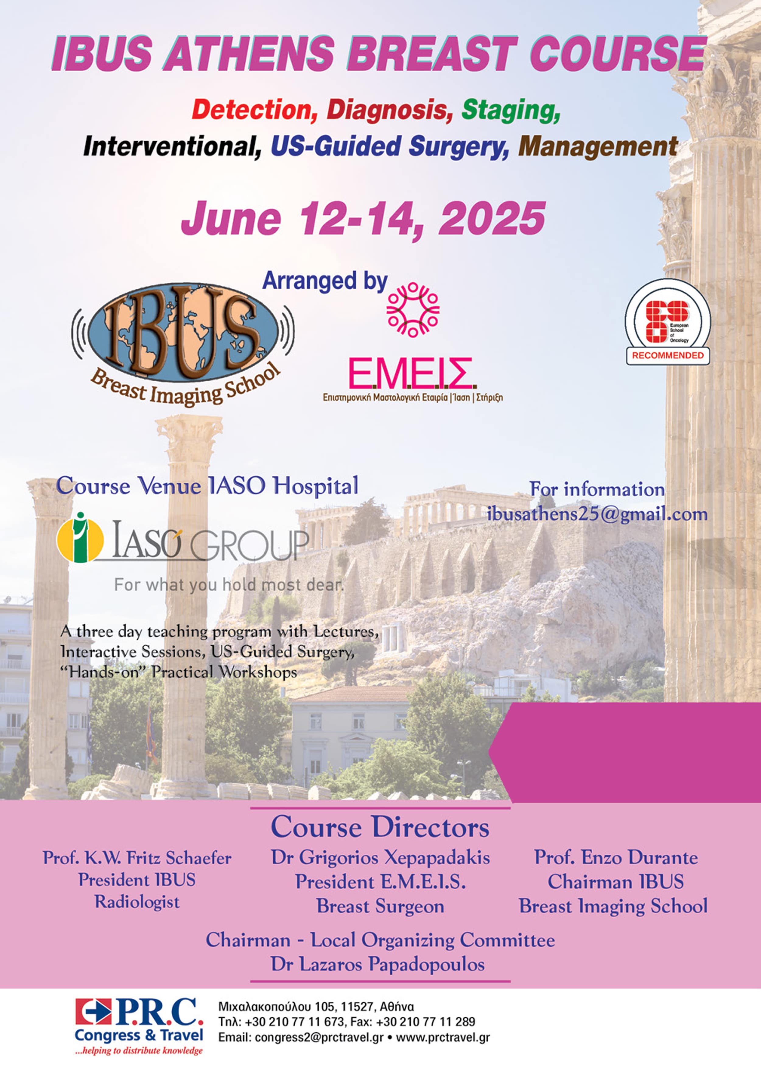Το 13ο IBUS Athens Breast Course, με επίκεντρο την Ανίχνευση, Διάγνωση, Σταδιοποίηση και τις Επεμβατικές Τεχνικές στον μαστό, θα πραγματοποιηθεί στην Αθήνα, από την Πέμπτη 12 Ιουνίου έως το Σάββατο 14 Ιουνίου 2025, στο ΙΑΣΩ (Λεωφόρος Κηφισίας 37-39, Μαρούσι).
