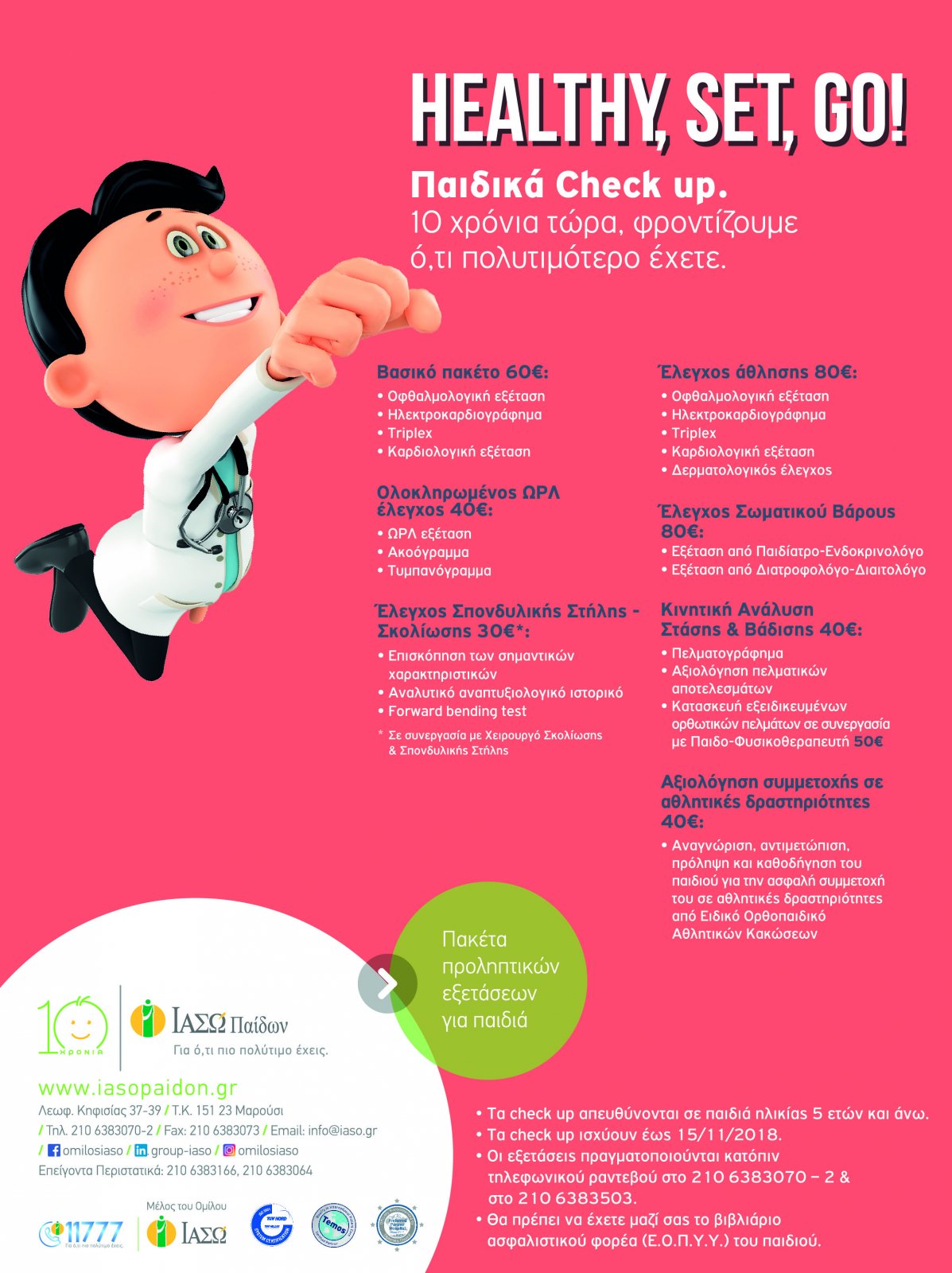 Με το μήνυμα «HEALTHY, SET, GO!», το ΙΑΣΩ Παίδων είναι έτοιμο να υποδεχτεί τους μικρούς του φίλους για την πραγματοποίηση των ολοκληρωμένων πακέτων προληπτικών εξετάσεων υγείας.