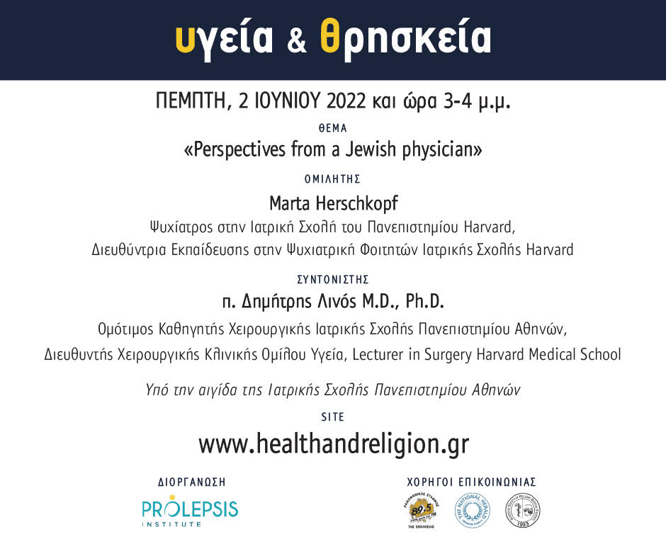 Η ομιλία με τίτλο “Perspectives from a Jewish physician” θα πραγματοποιηθεί από την Marta Herschkopf, Ψυχίατρο στην Ιατρική Σχολή του Πανεπιστημίου Harvard και Διευθύντρια Εκπαίδευσης στην Ψυχιατρική Φοιτητών της Ιατρικής Σχολής του Πανεπιστημίου Harvard.