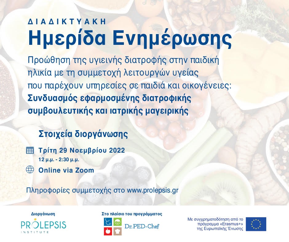 Με ιδιαίτερη χαρά το Ινστιτούτο Prolepsis σας προσκαλεί την Τρίτη 29 Νοεμβρίου 2022, ώρα 12:00 – 14:30, στην ενημερωτική διαδικτυακή εκδήλωση με θέμα: «Προώθηση της υγιεινής διατροφής στην παιδική ηλικία με τη συμμετοχή λειτουργών υγείας που παρέχουν υπηρεσίες σε παιδιά και οικογένειες: Συνδυασμός εφαρμοσμένης διατροφικής συμβουλευτικής και ιατρικής μαγειρικής»,