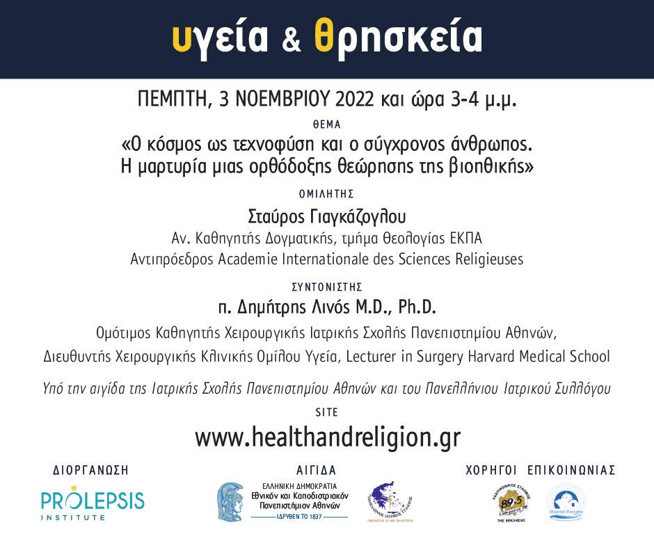 Την Πέμπτη 3 Νοεμβρίου 2022 και ώρα 15:00 – 16:00, θα πραγματοποιηθεί η πρώτη ομιλία του δεύτερου κύκλου διαδικτυακών μαθημάτων «Υγεία και Θρησκεία», τα οποία επιμελείται και συντονίζει ο Ομ. Καθηγητής της Χειρουργικής, π. Δημήτρης Λινός.