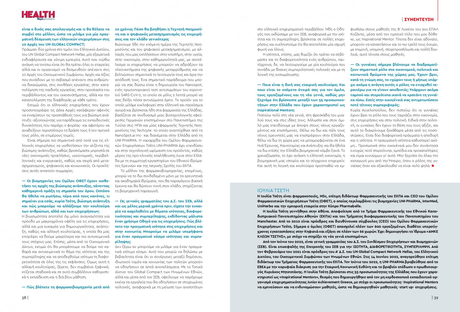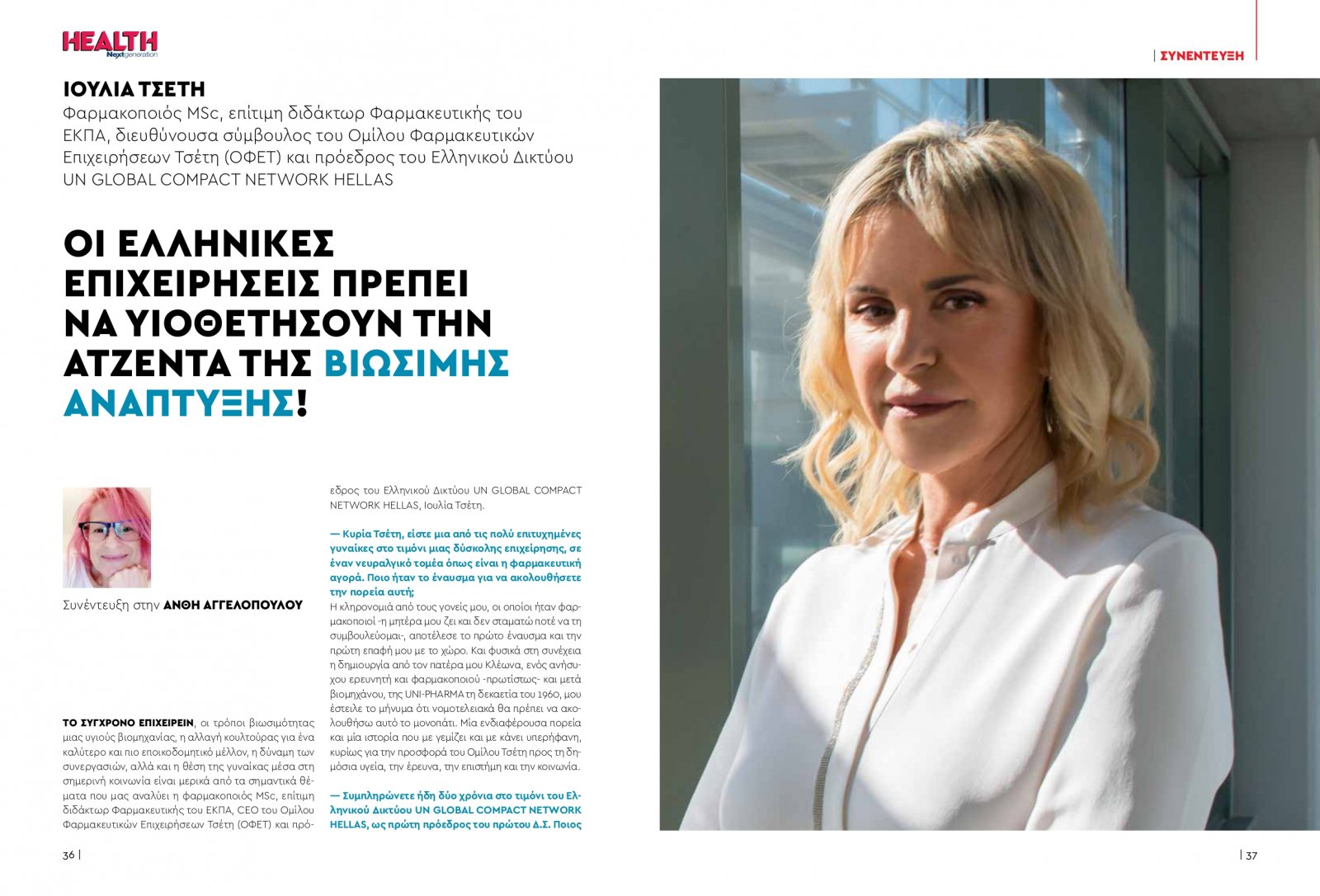 Το σύγχρονο επιχειρείν, οι τρόποι βιωσιμότητας μιας υγιούς βιομηχανίας, η αλλαγή κουλτούρας για ένα καλύτερο και πιο εποικοδομητικό μέλλον, η δύναμη των συνεργασιών, αλλά και η θέση της γυναίκας μέσα στη σημερινή κοινωνία είναι μερικά από τα σημαντικά θέματα που μας αναλύει στο περιοδικό Health Next Generation – Τεύχος 13 η φαρμακοποιός MSc, επίτιμη διδάκτωρ Φαρμακευτικής του ΕΚΠΑ, CEO του Ομίλου Φαρμακευτικών Επιχειρήσεων Τσέτη (ΟΦΕΤ) και πρόεδρος του Ελληνικού Δικτύου UN GLOBAL COMPACT NETWORK HELLAS, Ιουλία Τσέτη.