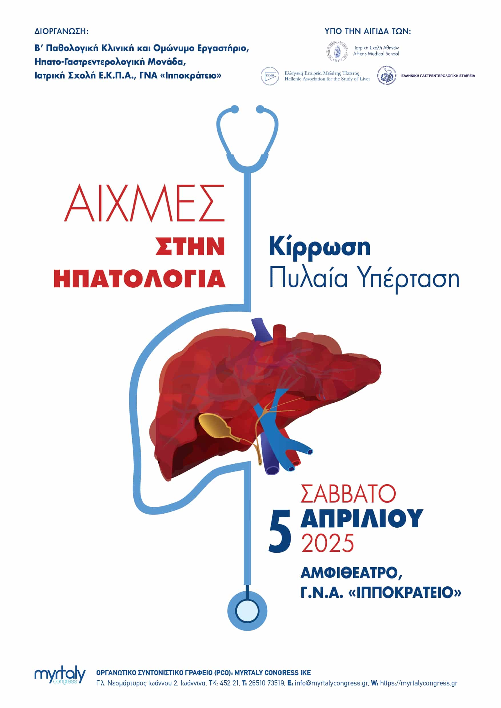 H Επιστημονική Ημερίδα θα λάβει χώρα, για 3η συνεχή χρονιά, το Σάββατο, 5 Απριλίου 2025, στο αμφιθέατρο του Γ.Ν.Α. «Ιπποκράτειο» στην Αθήνα, υπό την Αιγίδα της Ιατρικής Σχολής του Εθνικού και Καποδιστριακού Πανεπιστημίου Αθηνών, της Ελληνικής Εταιρείας Μελέτης Ήπατος και της Ελληνικής Γαστρεντερολογικής Εταιρείας.
