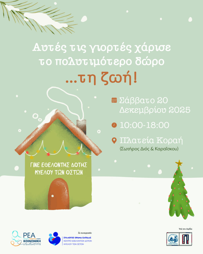 Η δράση θα πραγματοποιηθεί τo Σάββατο 20 Δεκεμβρίου 2025, ώρες 10:00- 18:00, στην Πλατεία Κοραή, Σωτήρος Διός & Καραΐσκου, Δήμος Πειραιά.