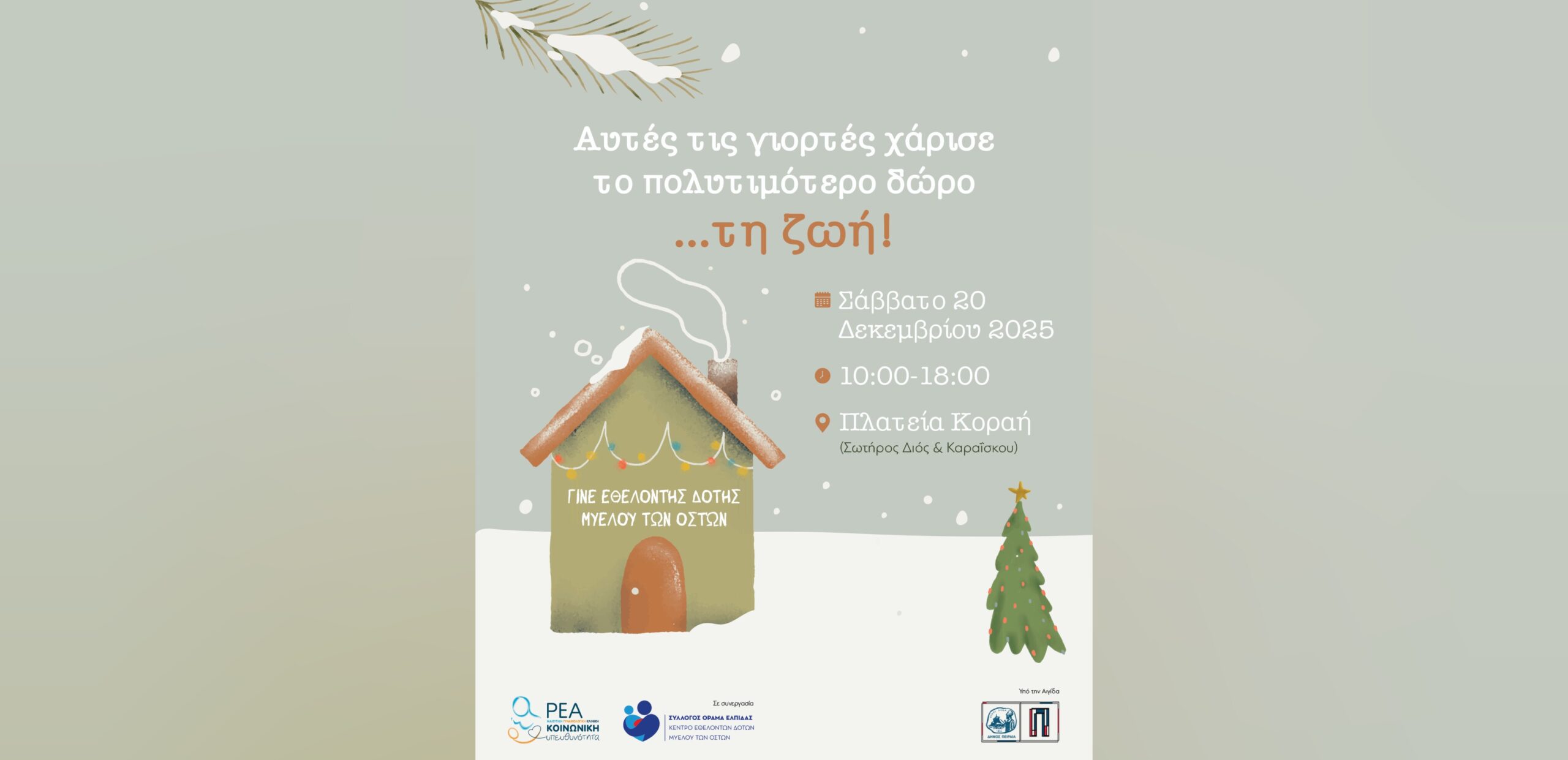 Η δράση θα πραγματοποιηθεί τo Σάββατο 20 Δεκεμβρίου 2025, ώρες 10:00- 18:00, στην Πλατεία Κοραή, Σωτήρος Διός & Καραΐσκου, Δήμος Πειραιά.