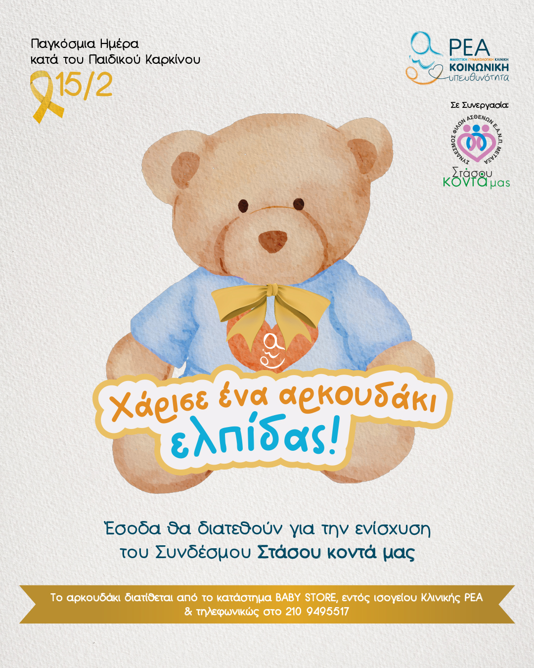 Η Κλινική ΡΕΑ με αφορμή την Παγκόσμια Ημέρα κατά του Παιδικού Καρκίνου (15 Φεβρουαρίου), στηρίζει τη μάχη κατά του καρκίνου με μια ξεχωριστή πρωτοβουλία. Από τις  11 Φεβρουαρίου 2025 και για όλο τον Φεβρουάριο, αρκουδάκια ελπίδας με κονκάρδα ευαισθητοποίησης για τον παιδικό καρκίνο θα διατίθενται από το κατάστημα BABY STORE, που βρίσκεται εντός του ισογείου της Κλινικής ΡΕΑ.