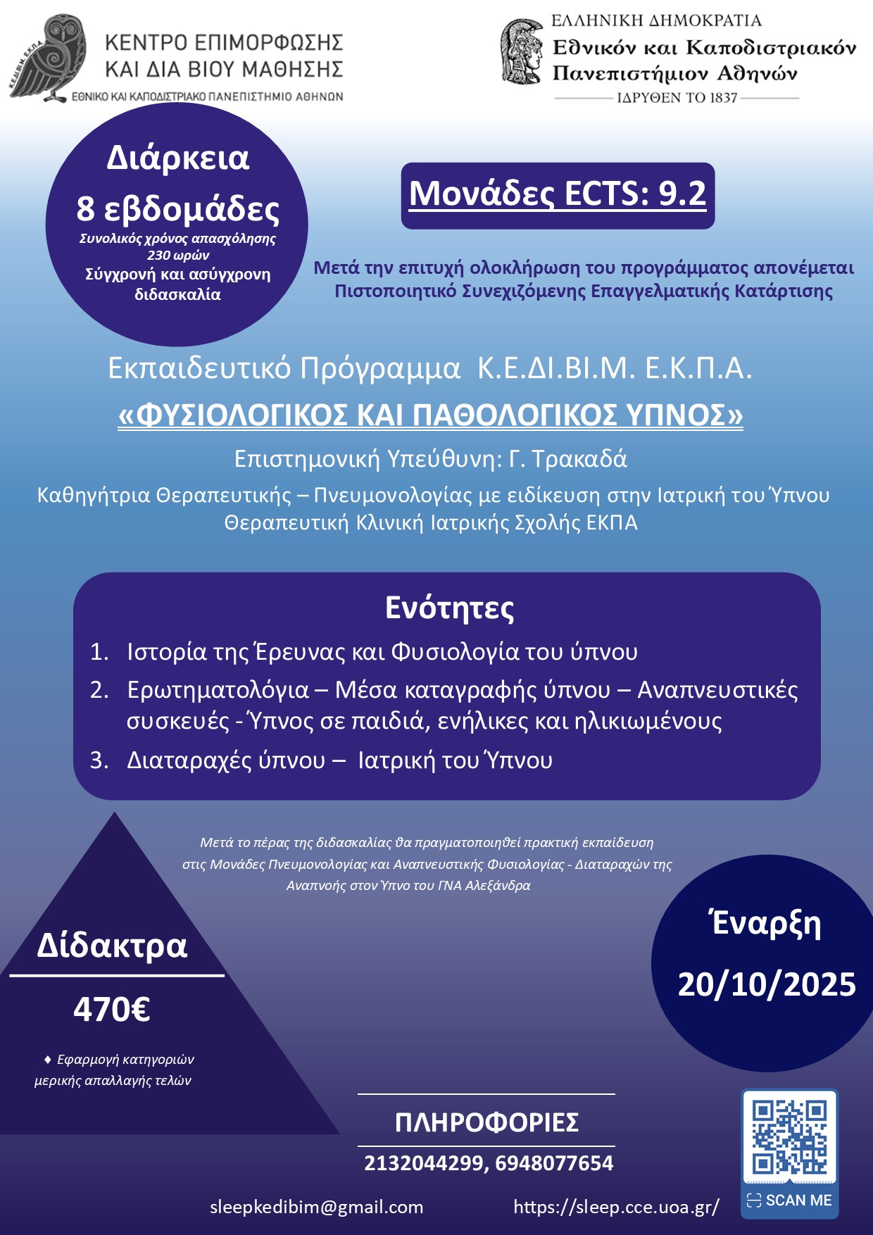 Το Κέντρο Επιμόρφωσης και Διά Βίου Μάθησης (Κ.Ε.ΔΙ.ΒΙ.Μ.) του Εθνικού και Καποδιστριακού Πανεπιστημίου Αθηνών ανακοινώνει την έναρξη των μαθημάτων του Εκπαιδευτικού Προγράμματος Συνεχιζόμενης Επαγγελματικής Κατάρτισης με τίτλο: «Φυσιολογικός και Παθολογικός Ύπνος».