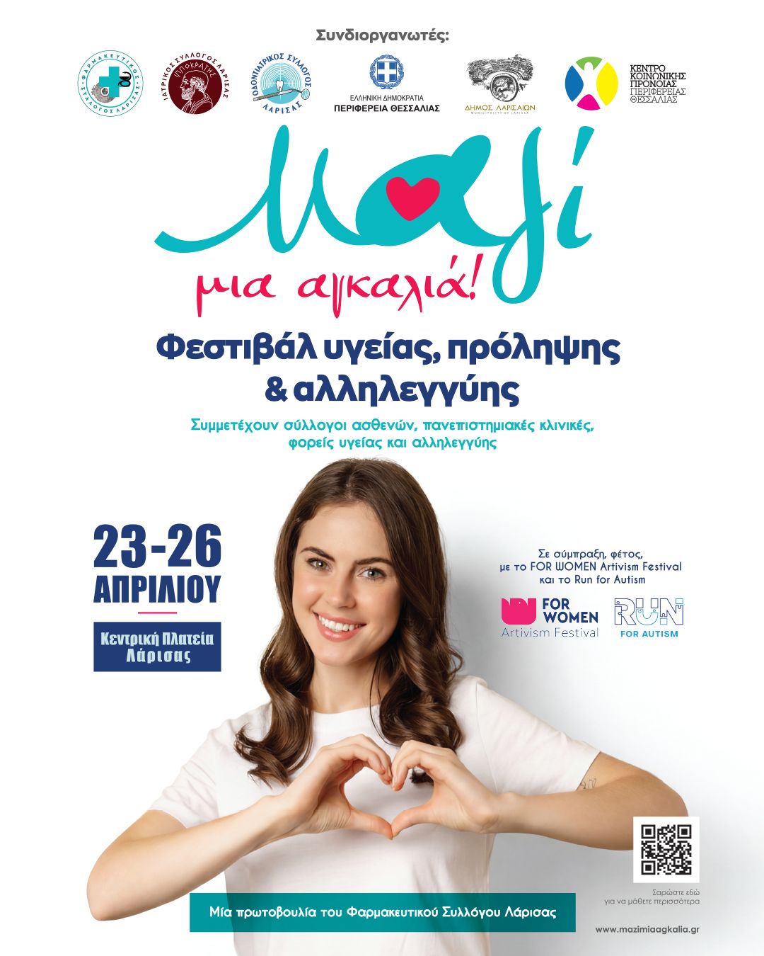 Για πέμπτη συνεχή χρονιά πραγματοποιείται από την Πέμπτη 23 έως και την Κυριακή 26 Απριλίου, στην Κεντρική Πλατεία της Λάρισας, η πολυθεματική δράση «ΜΑΖΙ ΜΙΑ ΑΓΚΑΛΙΑ», με στόχο την ανάδειξη των αξιών του ανθρωπισμού, του εθελοντισμού και της αλληλεγγύης, καθώς και την προώθηση της πρόληψης και ενός υγιεινού τρόπου ζωής.