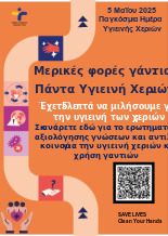 Ο Εθνικός Οργανισμός Δημόσιας Υγείας (ΕΟΔΥ) συμμετέχει στον εορτασμό της Παγκόσμιας Ημέρας της Υγιεινής Χεριών με την προετοιμασία και διάθεση ενημερωτικού υλικού.