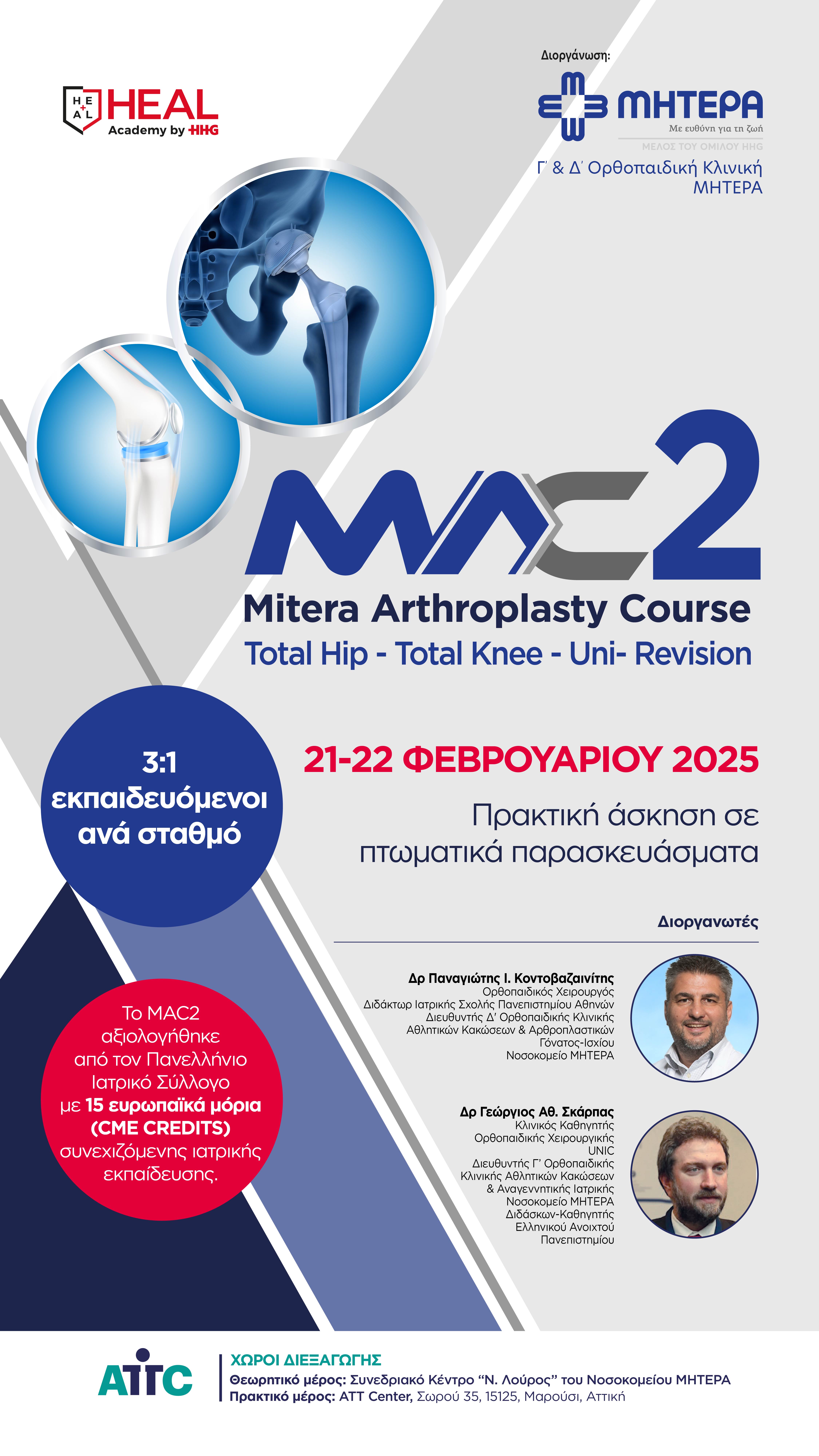 Με μεγάλη επιτυχία ολοκληρώθηκε το εκπαιδευτικό σεμινάριο «MAC 2», Mitera Arthroplasty Course, Total Hip-Total Knee-Uni-Revision», το θεωρητικό μέρος, του οποίου, πραγματοποιήθηκε την Παρασκευή 21 Φεβρουαρίου 2025 στο Συνεδριακό Κέντρο «Ν. Λούρος», του ΜΗΤΕΡΑ και το πρακτικό μέρος το Σάββατο 22 Φεβρουαρίου 2025, στο ATT Center, στο Μαρούσι.