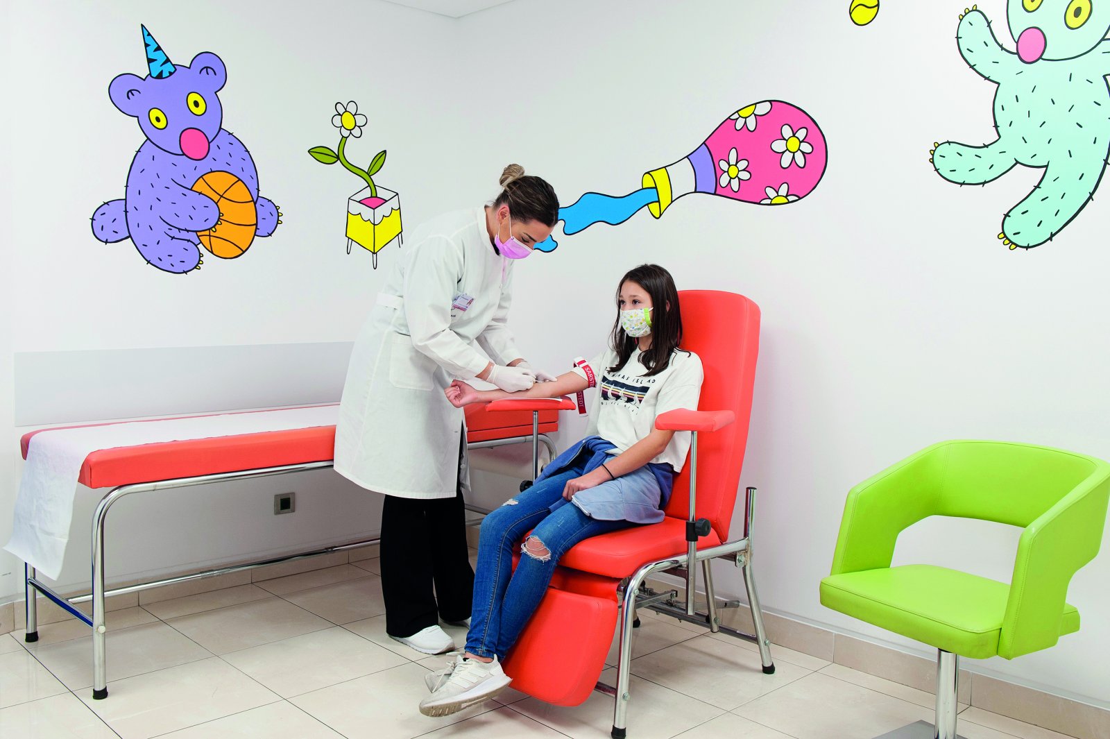 Το Κέντρο λειτουργεί υπό συνθήκες πλήρους ασφάλειας, σε περιβάλλον φιλικό τόσο για τα παιδιά όσο και για τους γονείς, ενώ διαθέτει ειδικά διαμορφωμένους χώρους για βρέφη και μικρά παιδιά, όπου πραγματοποιούνται αιµοληψίες από εξειδικευμένο ιατρικό και νοσηλευτικό προσωπικό, το οποίο κάνει την εµπειρία της επίσκεψης ανώδυνη και εύκολη.