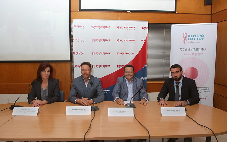 Στη φωτογραφία διακρίνονται: Ιωάννης Δουκουμόπουλος, γενικός χειρουργός, Νατάσα Παζαῒτη, διευθύντρια Κλινικής Χειρουργικής Ογκολογίας και Αποκατάστασης Μαστού, Παρασκευή Λιάκου, γενική χειρουργός-ειδική χειρουργός Μαστού, Δημήτριος Κορωνάρχης, διευθυντής Γ΄ Κλινικής Μαστού, Παναγιώτα-Τούλα Χατζηλύρα, διευθύντρια Κέντρου Μαστού, Στέργιος Δουβετζέμης, γενικός χειρουργός, Αννίβας Τσικκίνης, χειρουργός Μαστού, Κωνσταντίνος Στρατής, γενικός χειρουργός και Σπύρος Κοτρώτσιος, Γενικός Διευθυντής Μetropolitan General